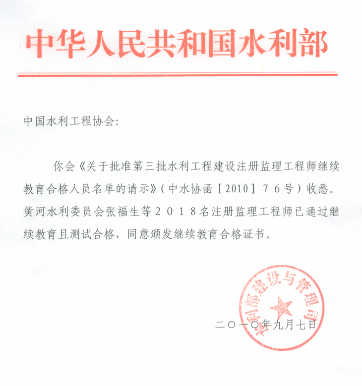 水利部建设与管理司《关于批准第三批水利工程建设注册监理工程师继续教育合格人员名单的批复》