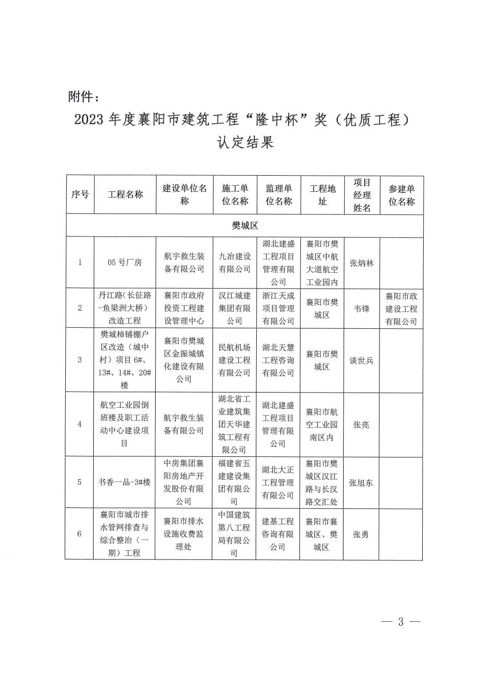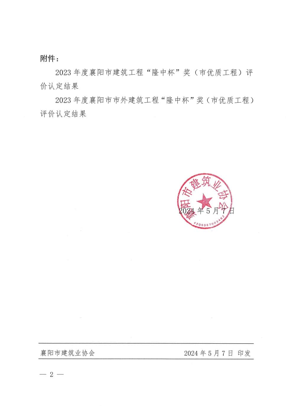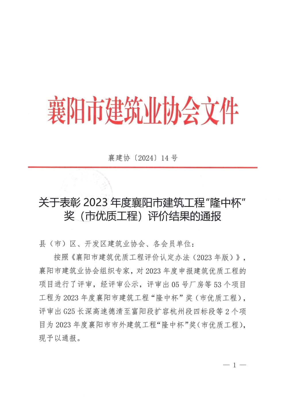 关于表彰2023年度襄阳市建筑工程“隆中杯”奖(市优质工程)评价结果的通报