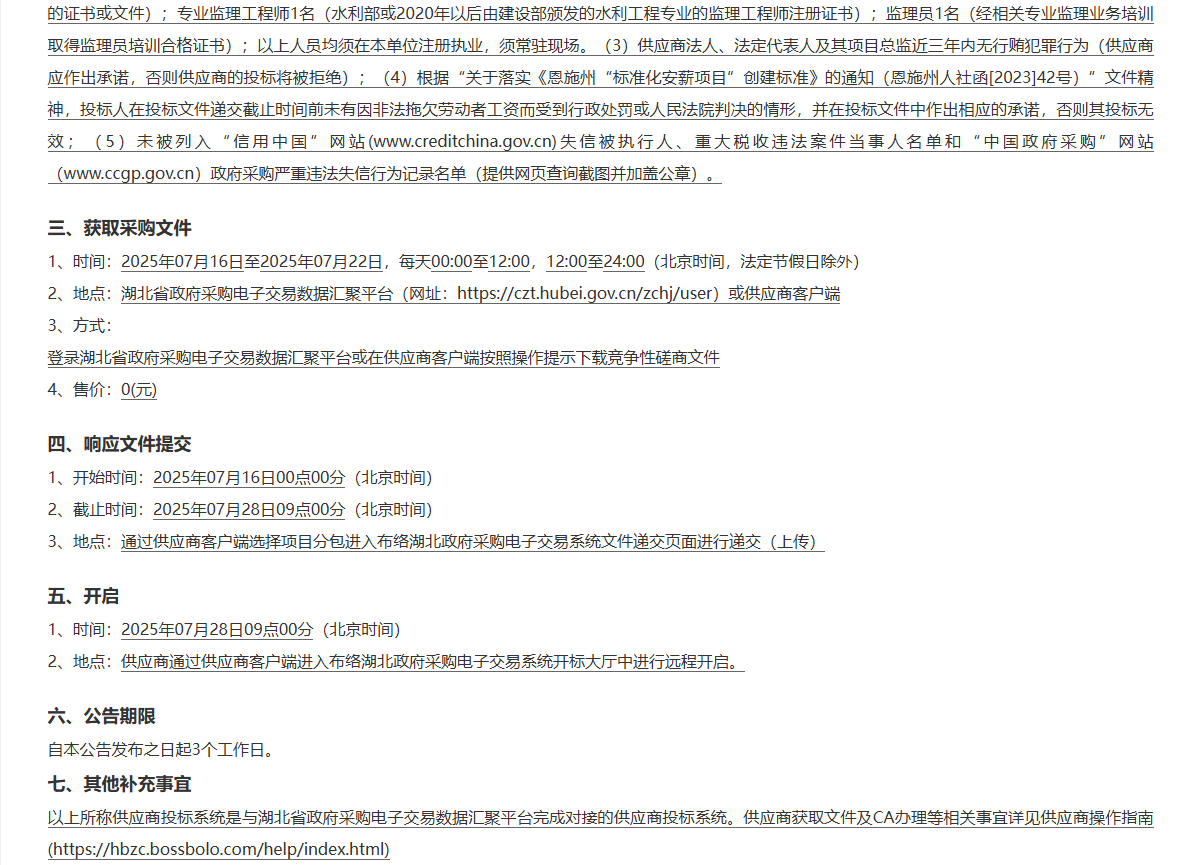 (1)供应商须具备水利部颁发的水利工程施工监理乙级及以上资质;(2)供应商拟派现场专职监理人员3名,其中:总监理工程师1名(具备由水利部或2020年以后由建设部颁发的全国水利工程建设监理工程师资格证书和水利工程类专业中级及以上技术职称,并提供供应商聘任该监理工程师为总监理工程师的证书或文件);专业监理工程师1名(水利部或2020年以后由建设部颁发的水利工程专业的监理工程师注册证书);监理员1名(经相关专业监理业务培训取得监理员培训合格证书);以上人员均须在本单位注册执业,须常驻现场。(3)供应商法人、法定代表人及其项目总监近三年内无行贿犯罪行为(供应商应作出承诺,否则供应商的投标将被拒绝);(4)根据“关于落实《恩施州“标准化安薪项目”创建标准》的通知(恩施州人社函[2023]42号)”文件精神,投标人在投标文件递交截止时间前未有因非法拖欠劳动者工资而受到行政处罚或人民法院判决的情形,并在投标文件中作出相应的承诺,否则其投标无效;(5)未被列入“信用中国”网站(www.creditchina.gov.cn)失信被执行人、重大税收违法案件当事人名单和“中国政府采购”网站(www.ccgp.gov.cn)政府采购严重违法失信行为记录名单(提供网页查询截图并加盖公章)。