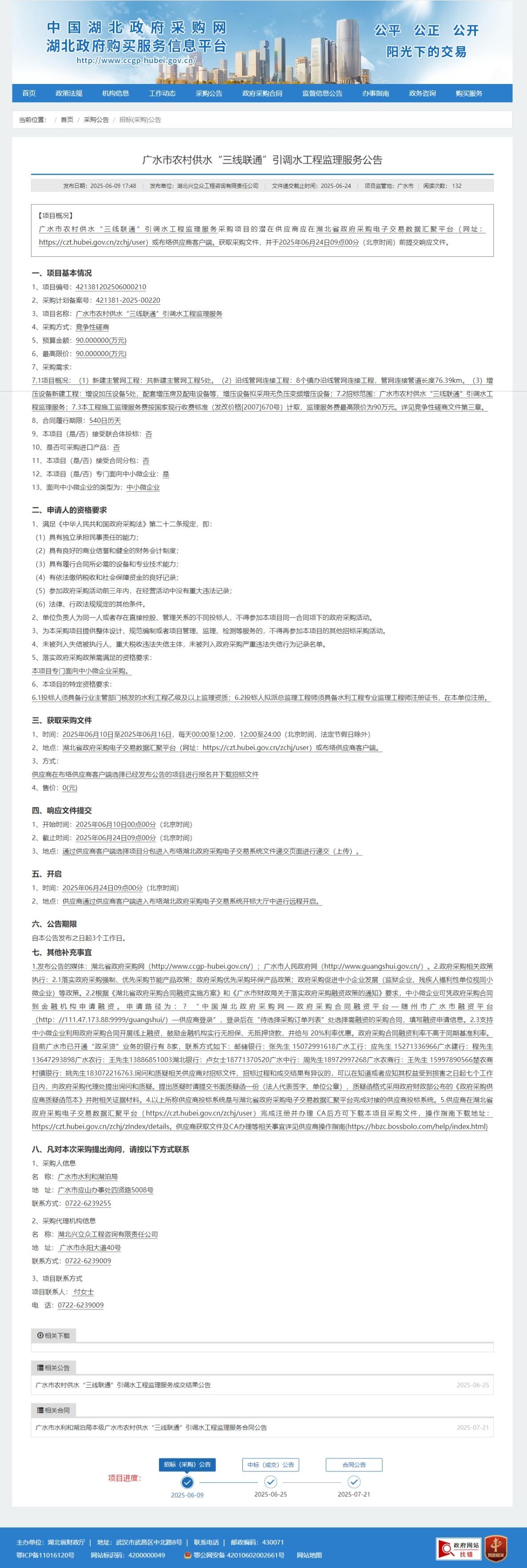 发布日期:2025-06-09 17:48 发布单位:湖北兴立众工程咨询有限责任公司 文件递交截止时间:2025-06-24 项目监管地:广水市