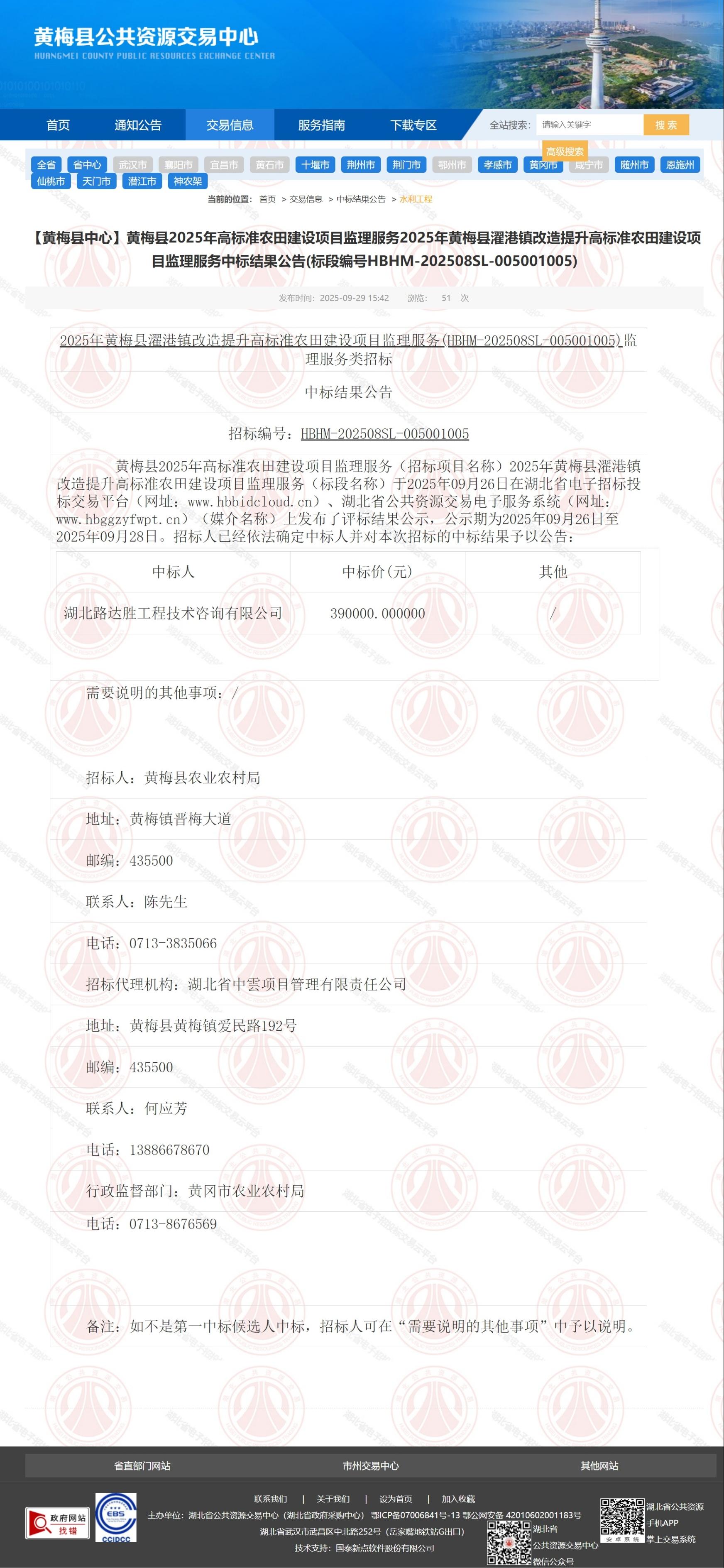黄梅县2025年高标准农田建设项目监理服务(招标项目名称)2025年黄梅县濯港镇改造提升高标准农田建设项目监理服务(标段名称)于2025年09月26日在湖北省电子招标投标交易平台(网址:www.hbbidcloud.cn)、湖北省公共资源交易电子服务系统(网址:www.hbggzyfwpt.cn)(媒介名称)上发布了评标结果公示,公示期为2025年09月26日至2025年09月28日。招标人已经依法确定中标人并对本次招标的中标结果予以公告: