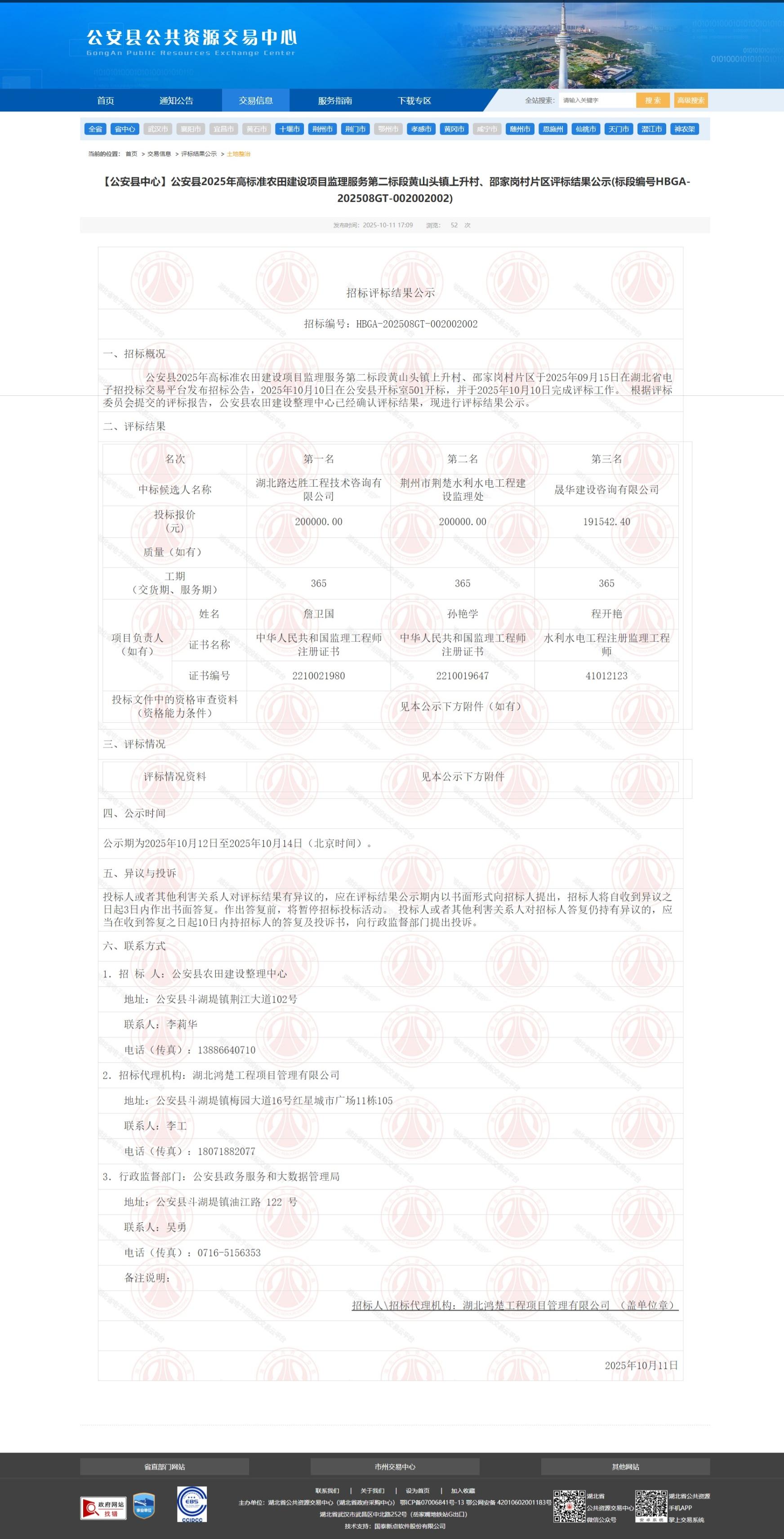 【公安县中心】公安县2025年高标准农田建设项目监理服务第二标段黄山头镇上升村、邵家岗村片区评标结果公示(标段编号HBGA-202508GT-002002002)