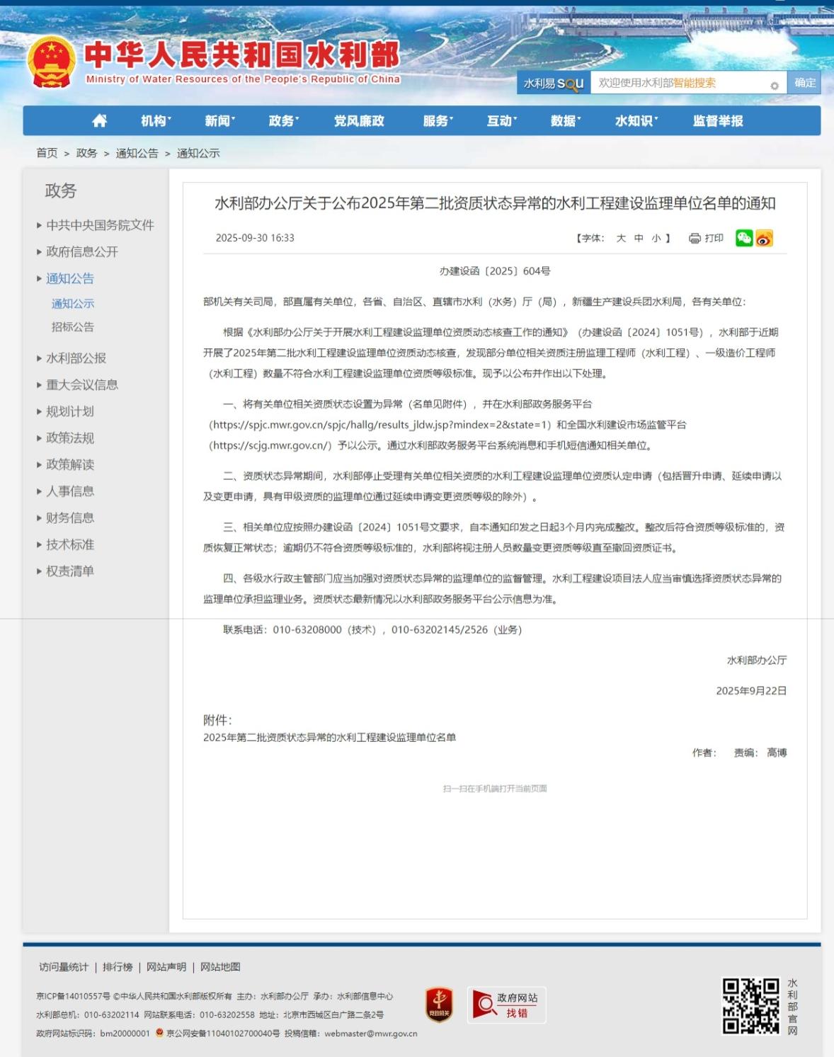 四、各级水行政主管部门应当加强对资质状态异常的监理单位的监督管理。水利工程建设项目法人应当审慎选择资质状态异常的监理单位承担监理业务。资质状态最新情况以水利部政务服务平台公示信息为准。