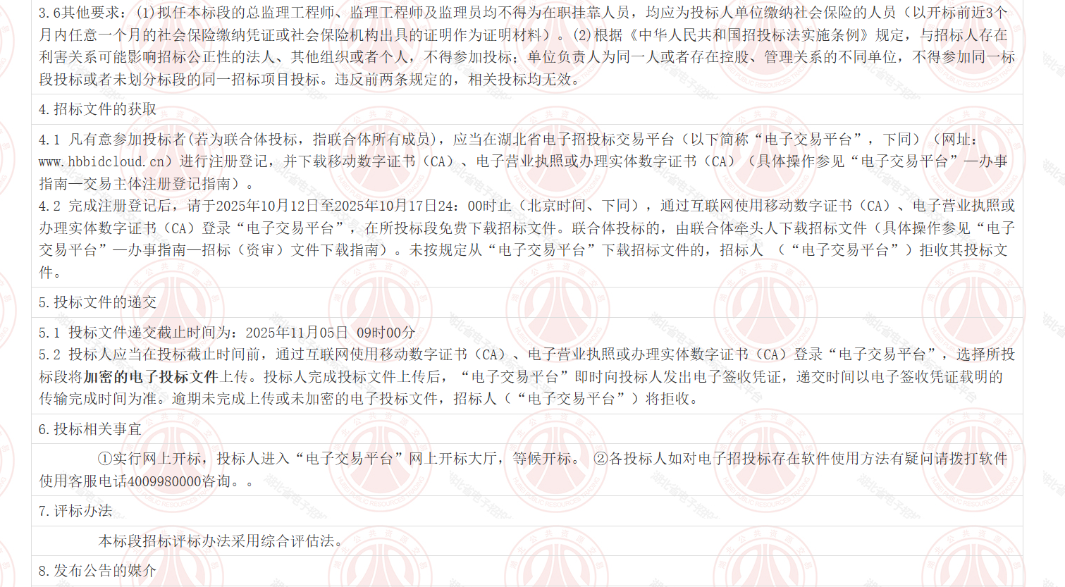| 4.1凡有意参加投标者(若为联合体投标,指联合体所有成员),应当在湖北省电子招投标交易平台(以下简称“电子交易平台”,下同)(网址:www.hbbidcloud.cn)进行注册登记,并下载移动数字证书(CA)、电子营业执照或办理实体数字证书(CA)(具体操作参见“电子交易平台”—办事指南—交易主体注册登记指南)。 4.2完成注册登记后,请于2025年10月12日至2025年10月17日24:00时止(北京时间、下同),通过互联网使用移动数字证书(CA)、电子营业执照或办理实体数字证书(CA)登录“电子交易平台”,在所投标段免费下载招标文件。联合体投标的,由联合体牵头人下载招标文件(具体操作参见“电子交易平台”—办事指南—招标(资审)文件下载指南)。未按规定从“电子交易平台”下载招标文件的,招标人 (“电子交易平台”)拒收其投标文件。 |