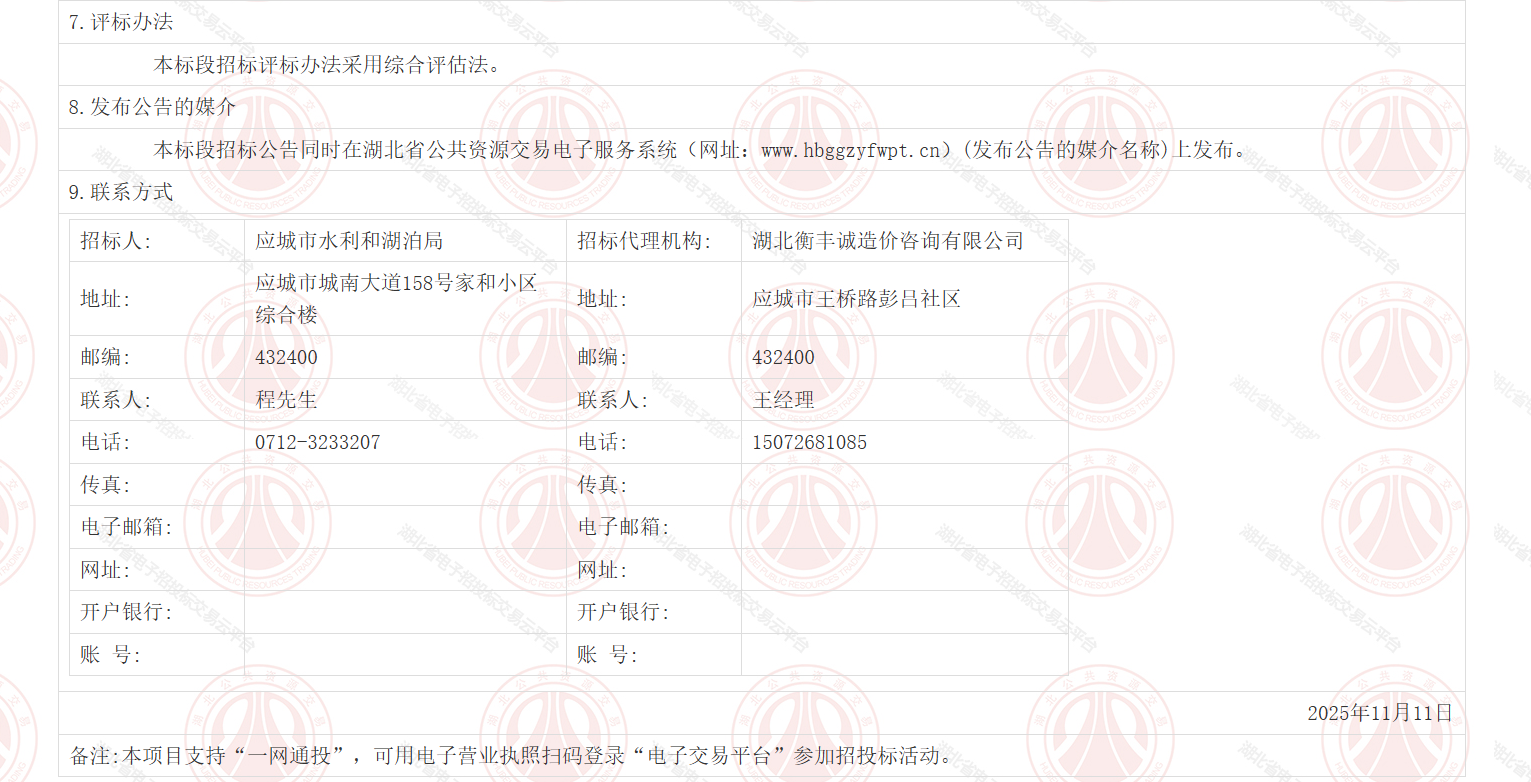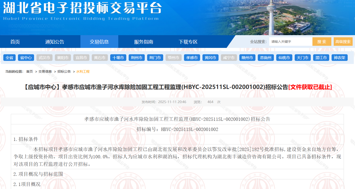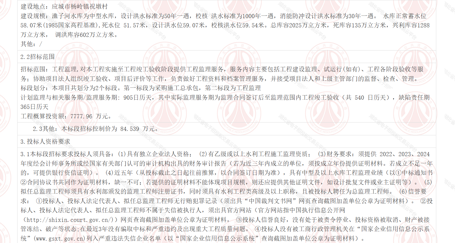 | 本招标项目孝感市应城市渔子河水库除险加固工程已由湖北省发展和改革委员会以鄂发改审批[2025]182号批准招标,建设资金来自地方自筹,争取上级投资补助。项目出资比例为100.0%。招标人为应城市水利和湖泊局,招标代理机构为湖北衡丰诚造价咨询有限公司。项目已具备招标条件,现对该项目的工程监理进行公开招标。 | ||||||||||||||||||||||||||||||||||||||||