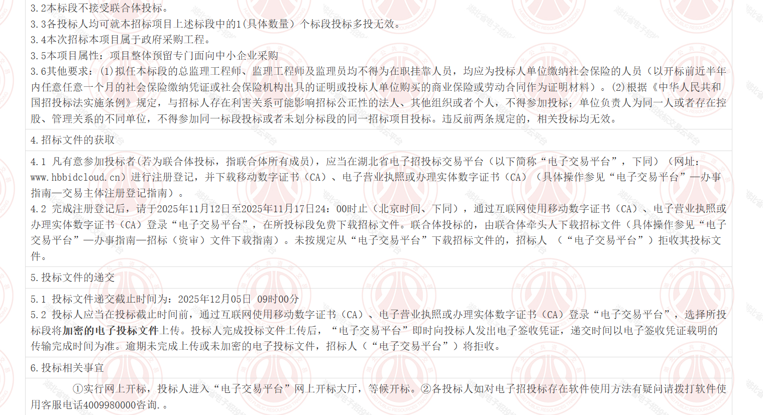 | 4.1 凡有意参加投标者(若为联合体投标,指联合体所有成员),应当在湖北省电子招投标交易平台(以下简称“电子交易平台”,下同)(网址:www.hbbidcloud.cn)进行注册登记,并下载移动数字证书(CA)、电子营业执照或办理实体数字证书(CA)(具体操作参见“电子交易平台”—办事指南—交易主体注册登记指南)。 4.2 完成注册登记后,请于2025年11月12日至2025年11月17日24:00时止(北京时间、下同),通过互联网使用移动数字证书(CA)、电子营业执照或办理实体数字证书(CA)登录“电子交易平台”,在所投标段免费下载招标文件。联合体投标的,由联合体牵头人下载招标文件(具体操作参见“电子交易平台”—办事指南—招标(资审)文件下载指南)。未按规定从“电子交易平台”下载招标文件的,招标人 (“电子交易平台”)拒收其投标文件。 |