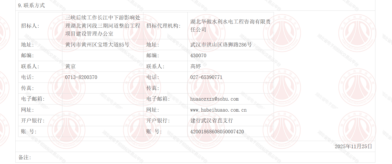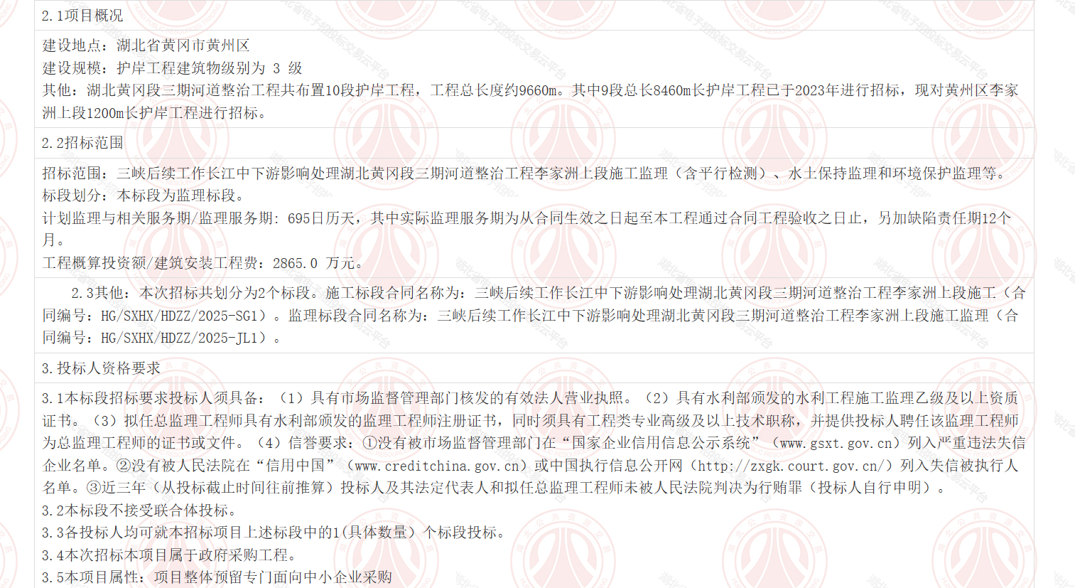 2.3其他:本次招标共划分为2个标段。施工标段合同名称为:三峡后续工作长江中下游影响处理湖北黄冈段三期河道整治工程李家洲上段施工(合同编号:HG/SXHX/HDZZ/2025-SG1)。监理标段合同名称为:三峡后续工作长江中下游影响处理湖北黄冈段三期河道整治工程李家洲上段施工监理(合同编号:HG/SXHX/HDZZ/2025-JL1)。