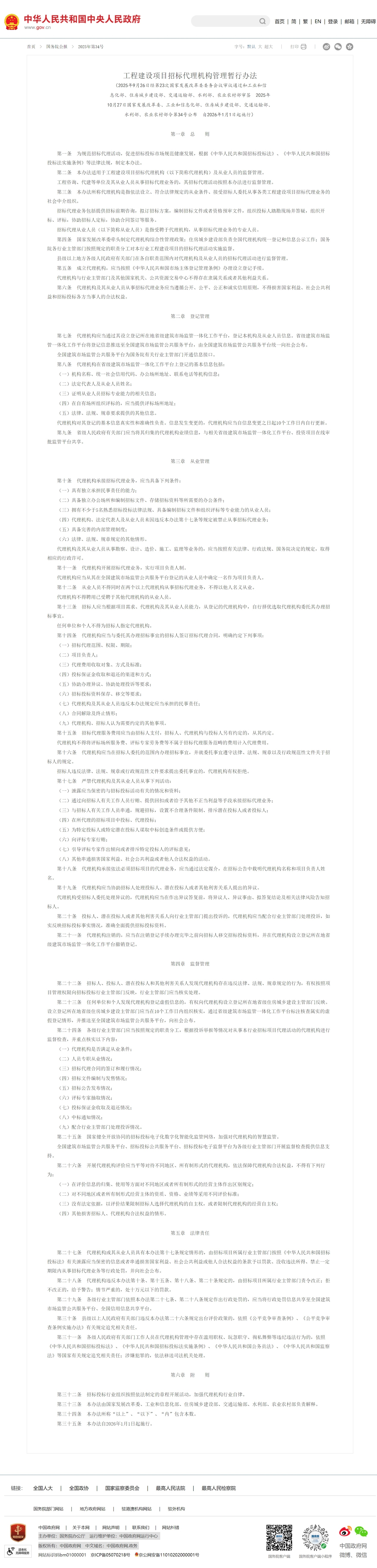 第四条 国家发展改革委牵头制定代理机构综合性管理政策;住房城乡建设部负责全国代理机构统一登记和信息公示工作;国务院各行业主管部门按照规定的职责分工对本行业工程建设项目的招标代理活动实施监督。