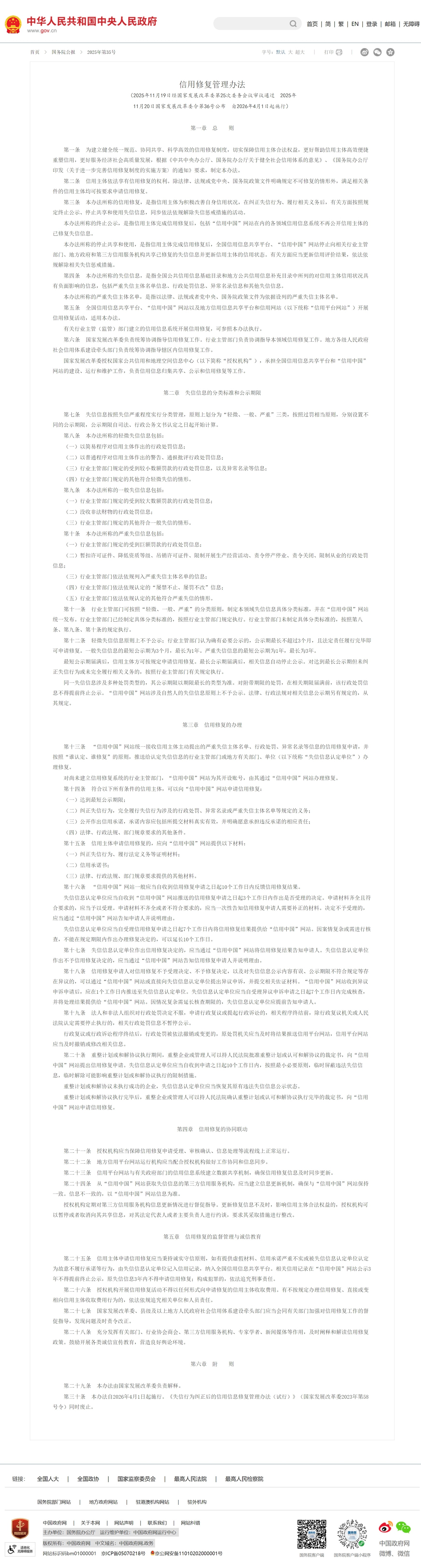 第三十条 本办法自2026年4月1日起施行。《失信行为纠正后的信用信息修复管理办法(试行)》(国家发展改革委2023年第58号令)同时废止。