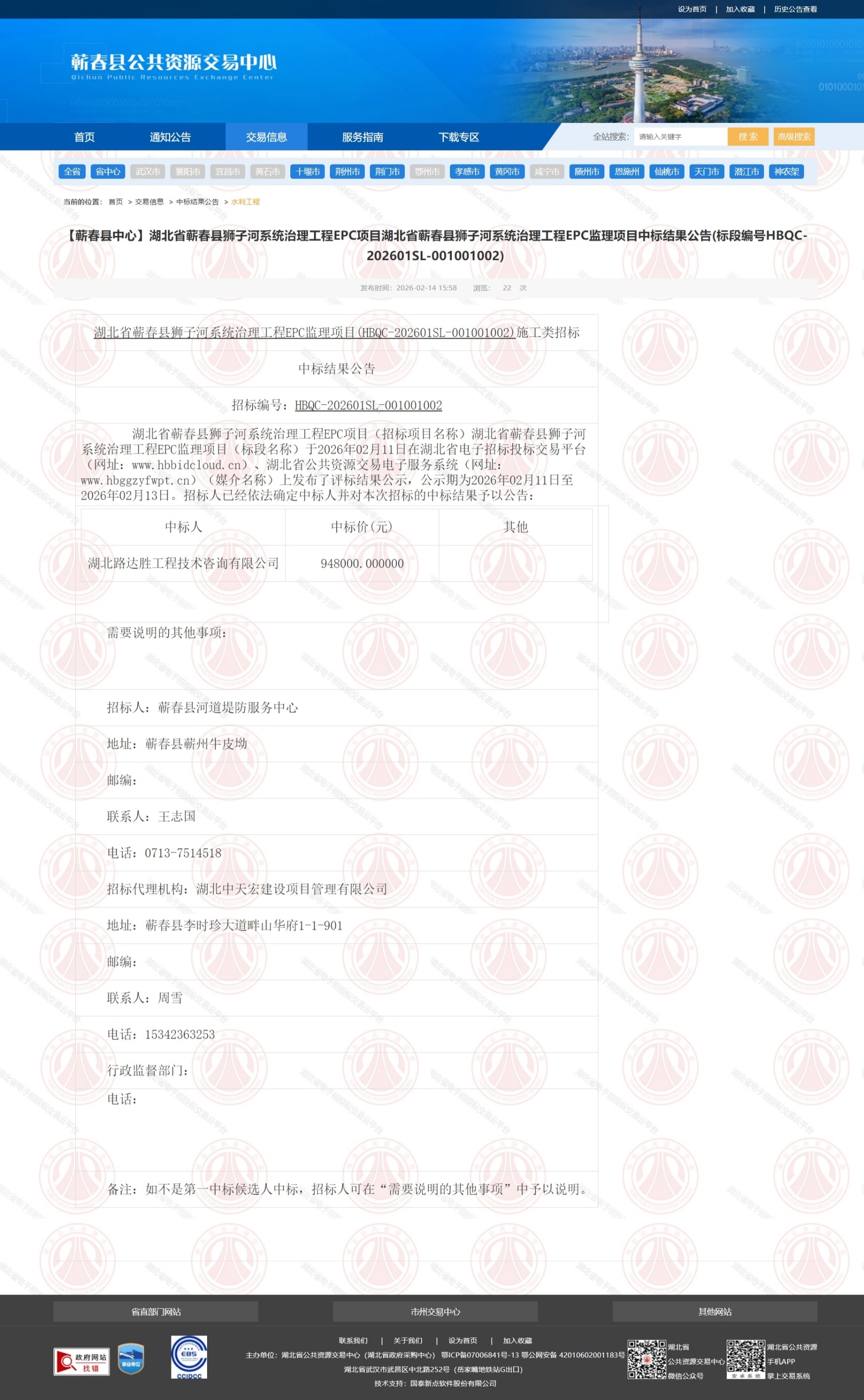 湖北省蕲春县狮子河系统治理工程EPC项目(招标项目名称)湖北省蕲春县狮子河系统治理工程EPC监理项目(标段名称)于2026年02月11日在湖北省电子招标投标交易平台(网址:www.hbbidcloud.cn)、湖北省公共资源交易电子服务系统(网址:www.hbggzyfwpt.cn)(媒介名称)上发布了评标结果公示,公示期为2026年02月11日至2026年02月13日。招标人已经依法确定中标人并对本次招标的中标结果予以公告:
