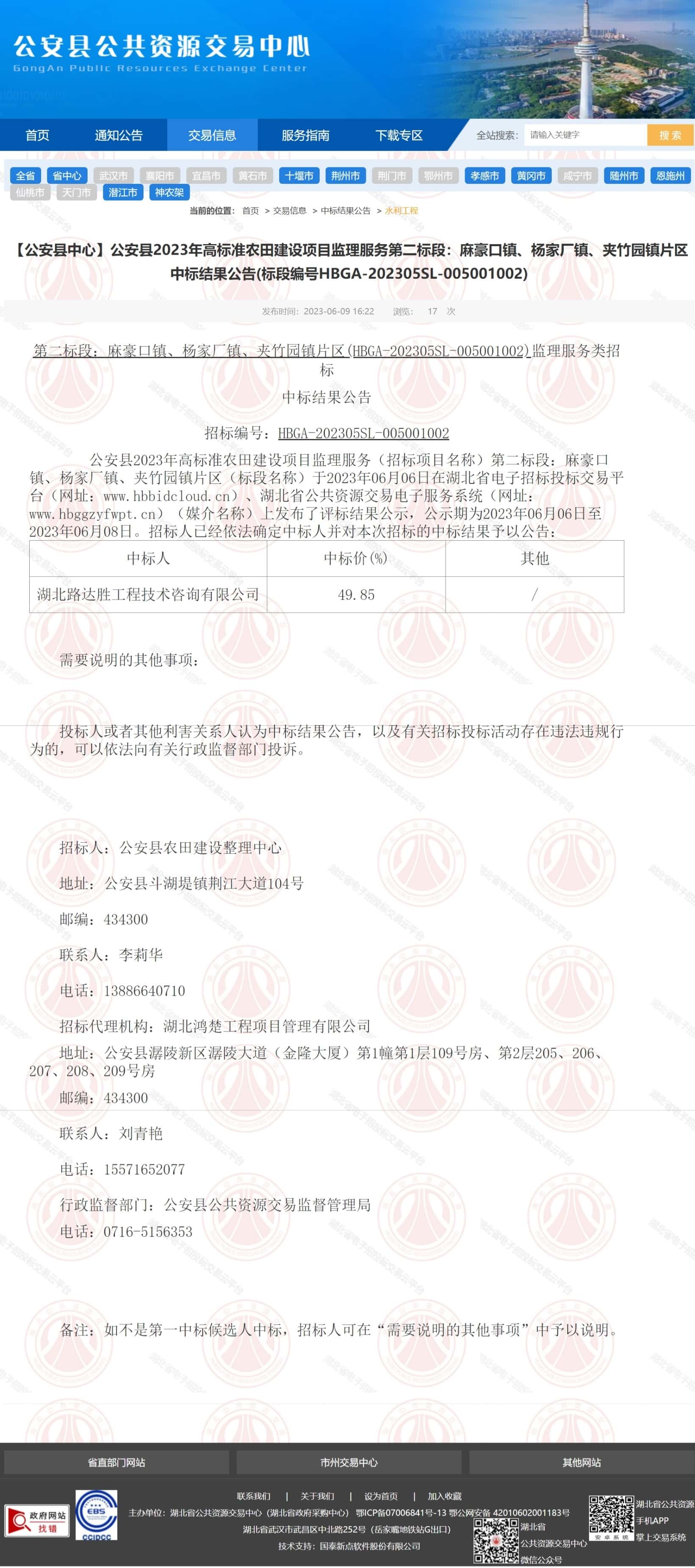 公安县2023年高标准农田建设项目监理服务(招标项目名称)第二标段:麻豪口镇、杨家厂镇、夹竹园镇片区(标段名称)于2023年06月06日在湖北省电子招标投标交易平台(网址:www.hbbidcloud.cn)、湖北省公共资源交易电子服务系统(网址:www.hbggzyfwpt.cn)(媒介名称)上发布了评标结果公示,公示期为2023年06月06日至2023年06月08日。招标人已经依法确定中标人并对本次招标的中标结果予以公告: