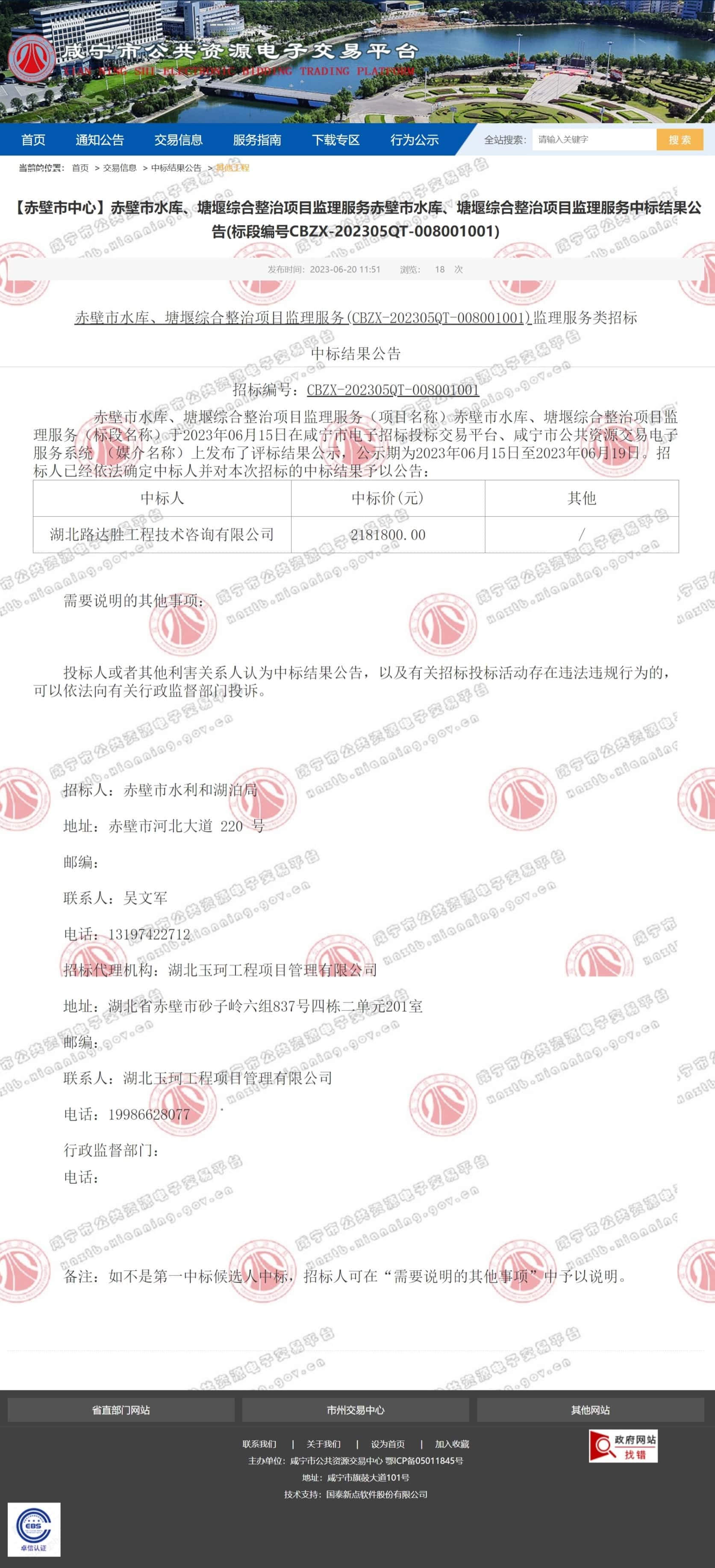 赤壁市水库、塘堰综合整治项目监理服务(CBZX-202305QT-008001001)监理服务类招标中标结果公告