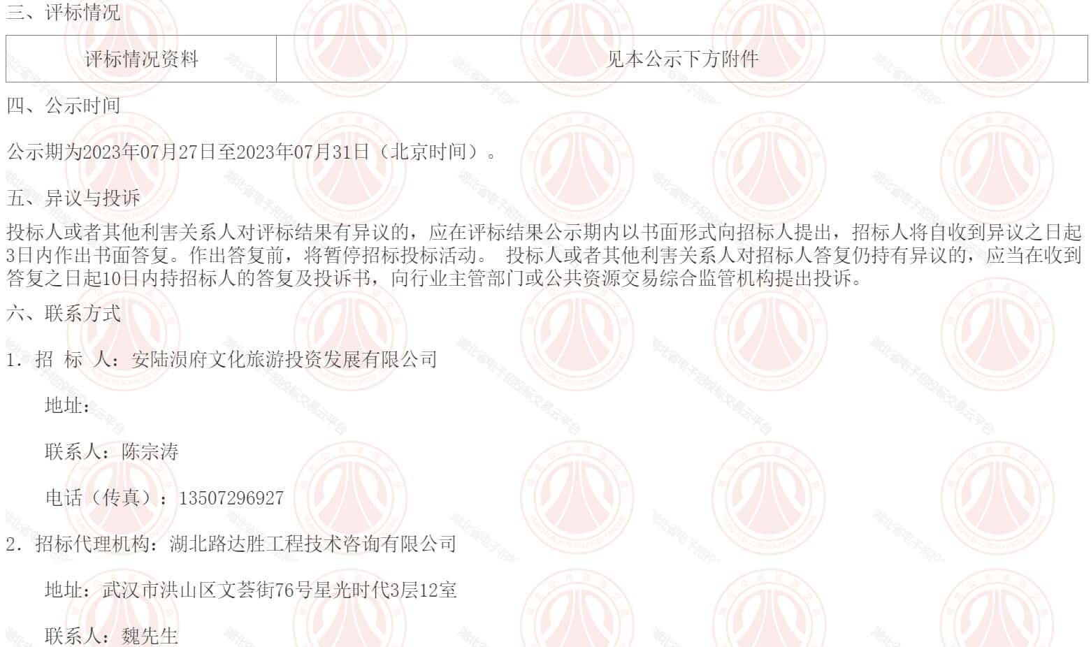 安陆市金泉泵站灌区续建配套与节水改造项目安陆市金泉泵站灌区续建配套与节水改造项目(EPC)于2023年06月29日在湖北省电子招投标交易平台发布招标公告,2023年07月25日在安陆第一开标室开标,并于2023年07月25日完成评标工作。根据评标委员会提交的评标报告,安陆涢府文化旅游投资发展有限公司已经确认评标结果,现进行评标结果公示。