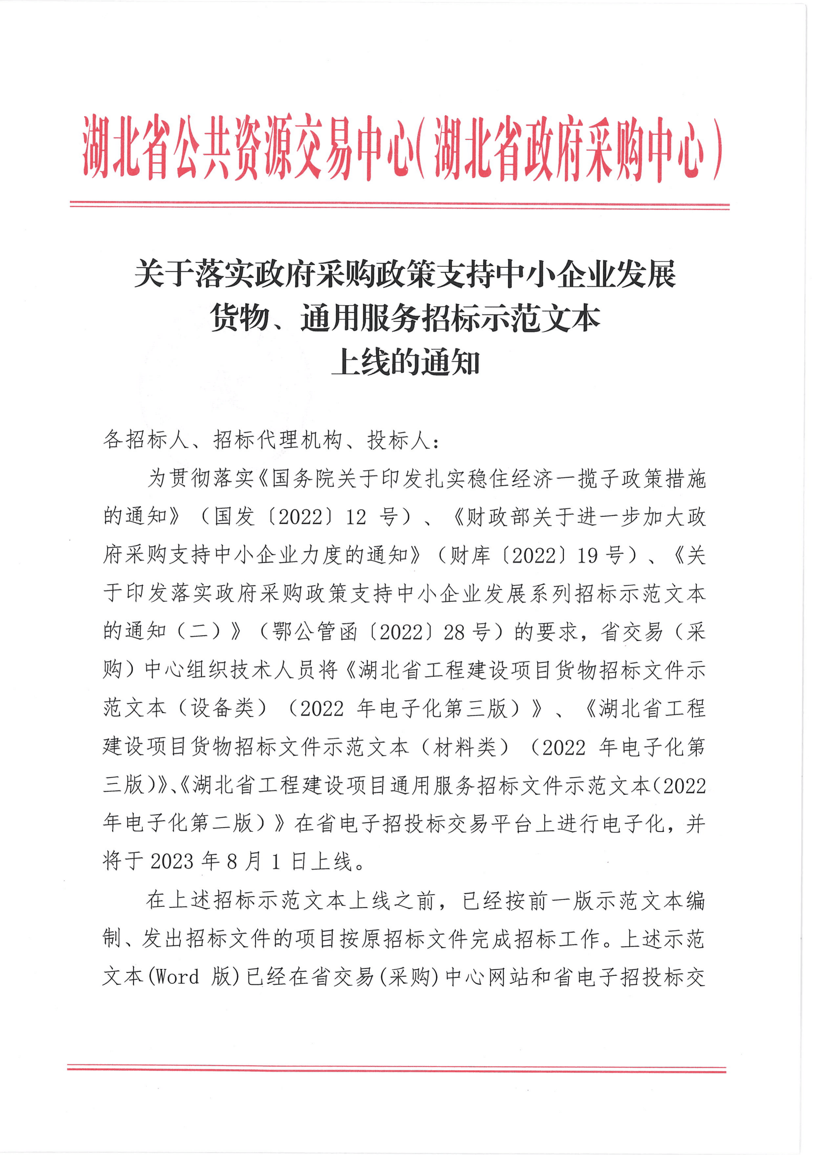为贯彻落实《国务院关于印发扎实稳住经济一揽子政策措施的通知》(国发〔2022〕12号)、《财政部关于进一步加大政府采购支持中小企业力度的通知》(财库〔2022〕19号)、《关于印发落实政府采购政策支持中小企业发展系列招标示范文本的通知(二)》(鄂公管函〔2022〕28号)的要求,省交易(采购)中心组织技术人员将《湖北省工程建设项目货物招标文件示范文本(设备类)(2022年电子化第三版)》、《湖北省工程建设项目货物招标文件示范文本(材料类)(2022年电子化第三版)》、《湖北省工程建设项目通用服务招标文件示范文本(2022年电子化第二版)》在省电子招投标交易平台上进行电子化,并将于2023年8月1日上线。