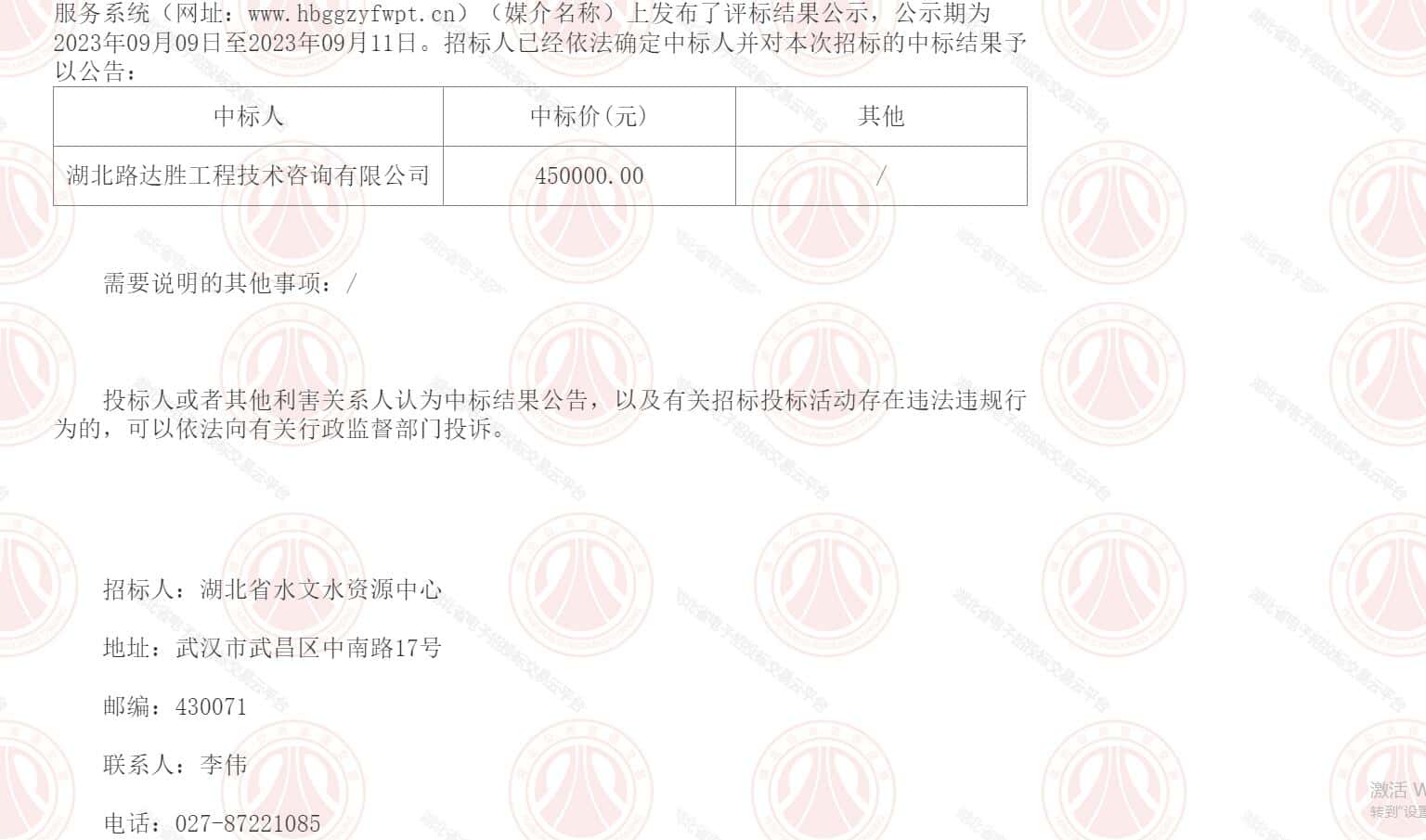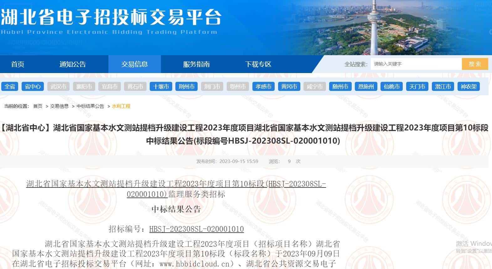 湖北省国家基本水文测站提档升级建设工程2023年度项目(招标项目名称)湖北省国家基本水文测站提档升级建设工程2023年度项目第10标段(标段名称)于2023年09月09日在湖北省电子招标投标交易平台(网址:www.hbbidcloud.cn)、湖北省公共资源交易电子服务系统(网址:www.hbggzyfwpt.cn)(媒介名称)上发布了评标结果公示,公示期为2023年09月09日至2023年09月11日。招标人已经依法确定中标人并对本次招标的中标结果予以公告: