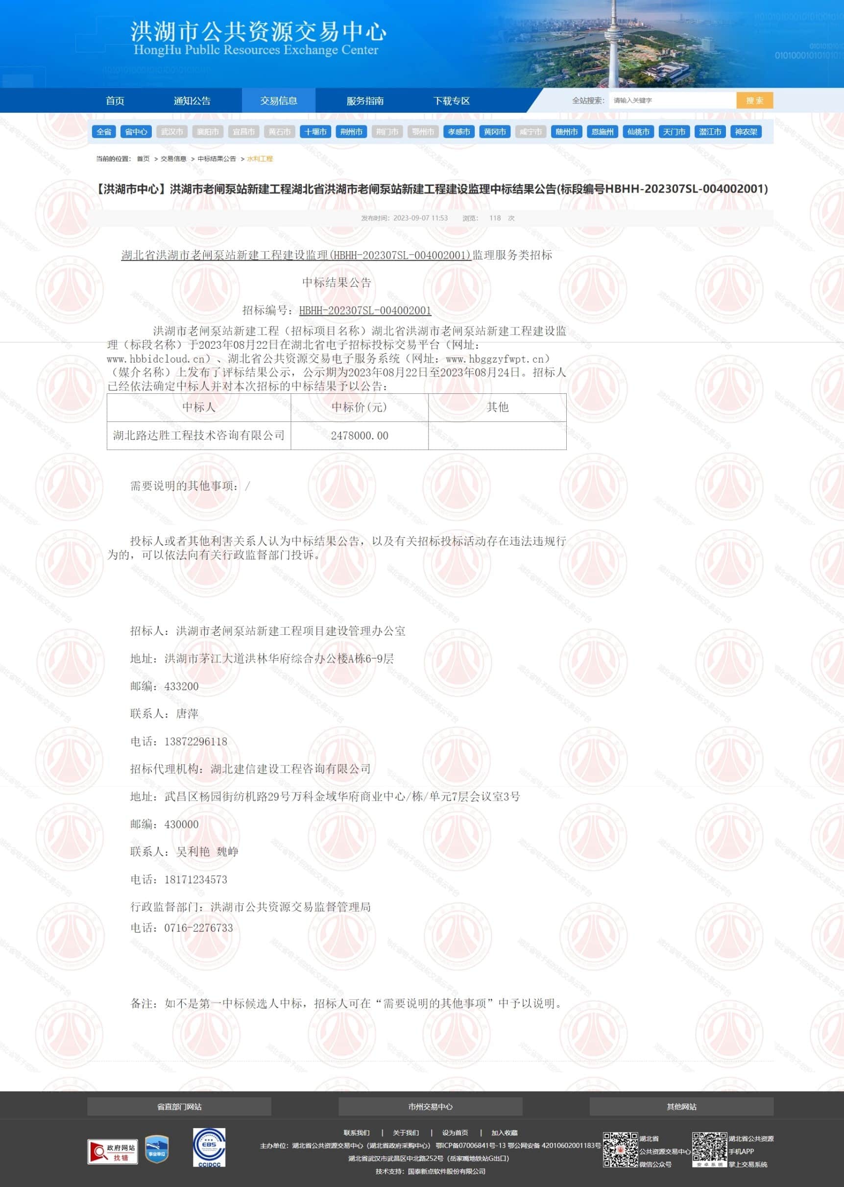 【洪湖市中心】洪湖市老闸泵站新建工程湖北省洪湖市老闸泵站新建工程建设监理中标结果公告(标段编号HBHH-202307SL-004002001)