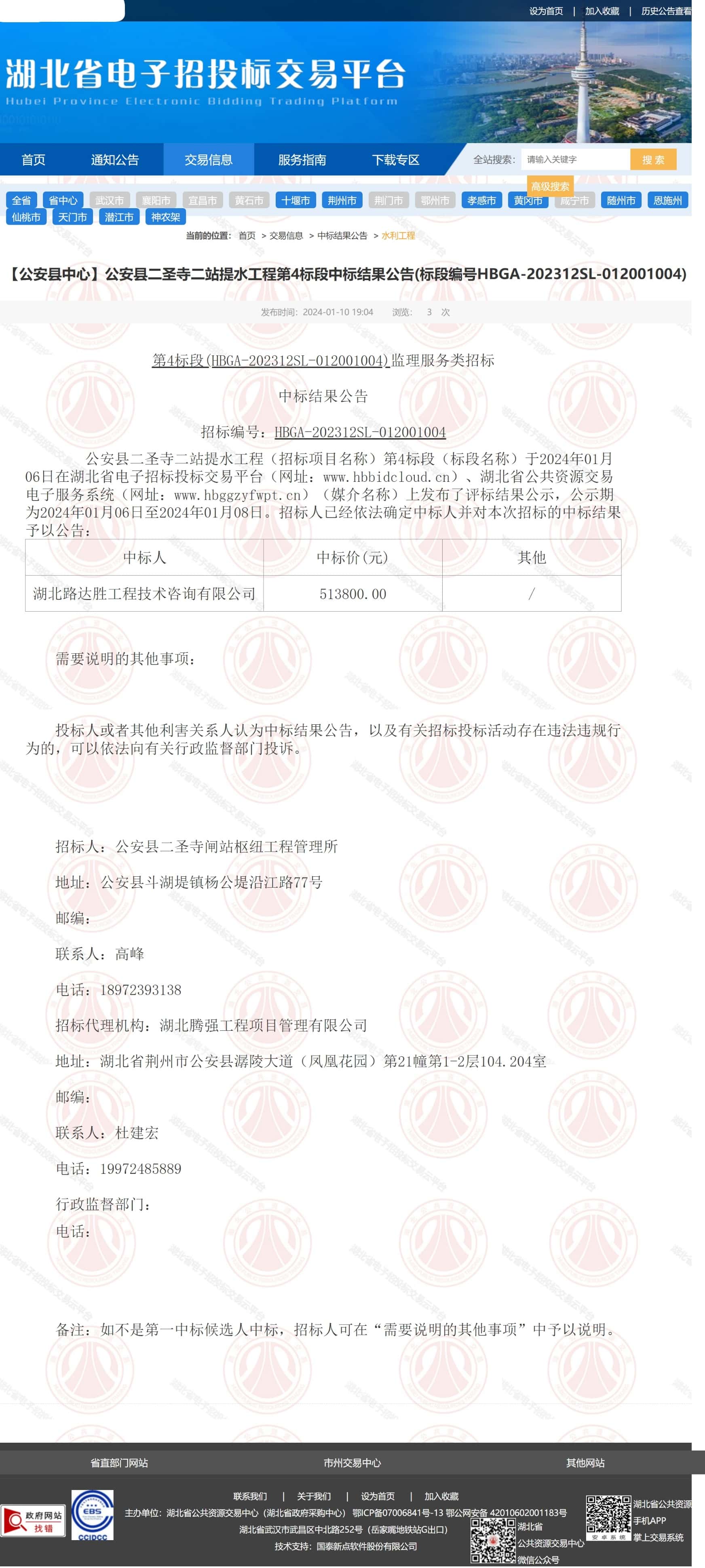 公安县二圣寺二站提水工程(招标项目名称)第4标段(标段名称)于2024年01月06日在湖北省电子招标投标交易平台(网址:www.hbbidcloud.cn)、湖北省公共资源交易电子服务系统(网址:www.hbggzyfwpt.cn)(媒介名称)上发布了评标结果公示,公示期为2024年01月06日至2024年01月08日。招标人已经依法确定中标人并对本次招标的中标结果予以公告: