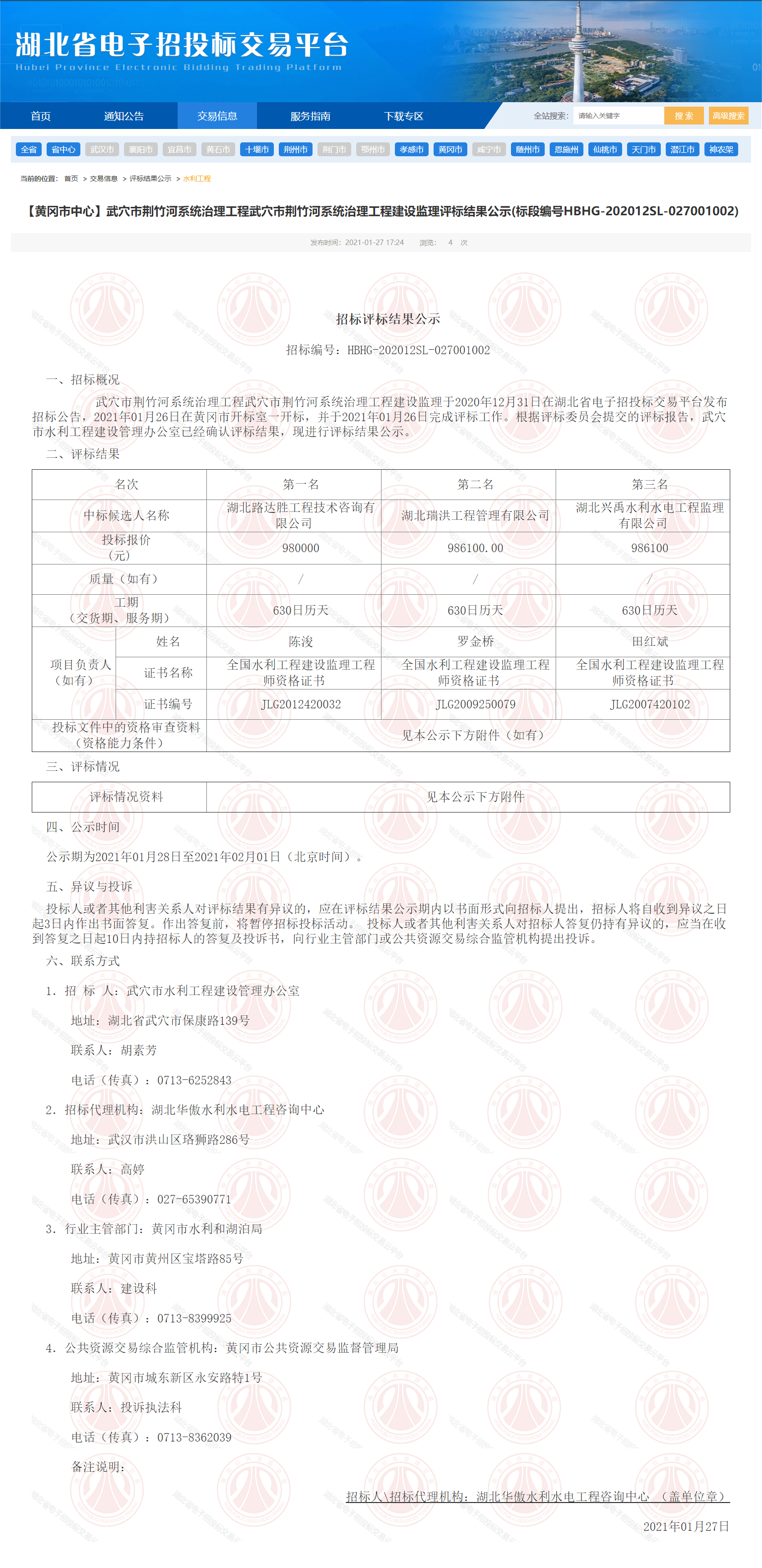 武穴市荆竹河系统治理工程武穴市荆竹河系统治理工程建设监理于2020年12月31日在湖北省电子招投标交易平台发布招标公告,2021年01月26日在黄冈市开标室一开标,并于2021年01月26日完成评标工作。根据评标委员会提交的评标报告,武穴市水利工程建设管理办公室已经确认评标结果,现进行评标结果公示。