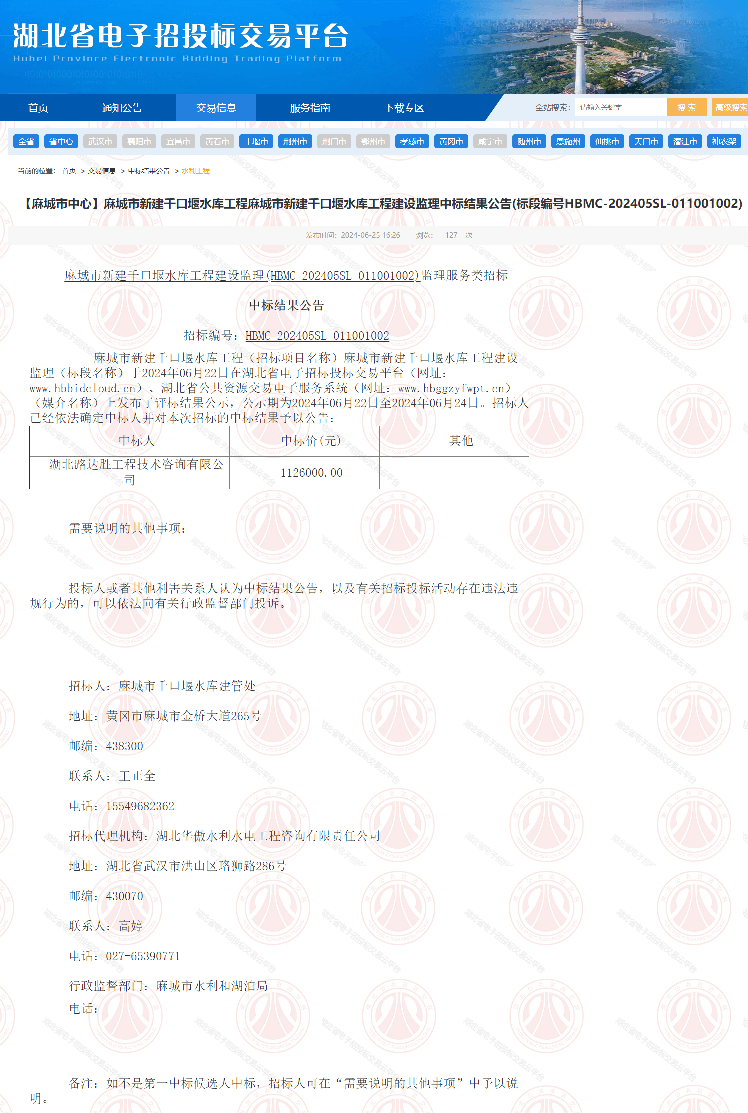 麻城市新建千口堰水库工程麻城市新建千口堰水库工程建设监理中标结果公告
