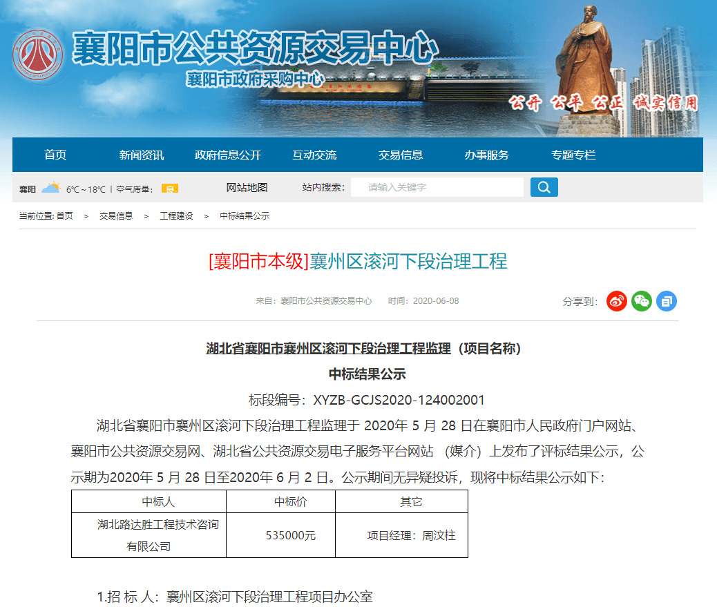 湖北省襄阳市襄州区滚河下段治理工程监理于 2020年 5 月 28 日在襄阳市人民政府门户网站、襄阳市公共资源交易网、湖北省公共资源交易电子服务平台网站 (媒介)上发布了评标结果公示,公示期为2020年 5 月 28 日至2020年 6 月 2 日。公示期间无异疑投诉,现将中标结果公示如下: