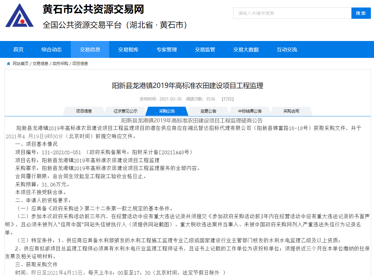 阳新县龙港镇2019年高标准农田建设项目工程监理磋商公告