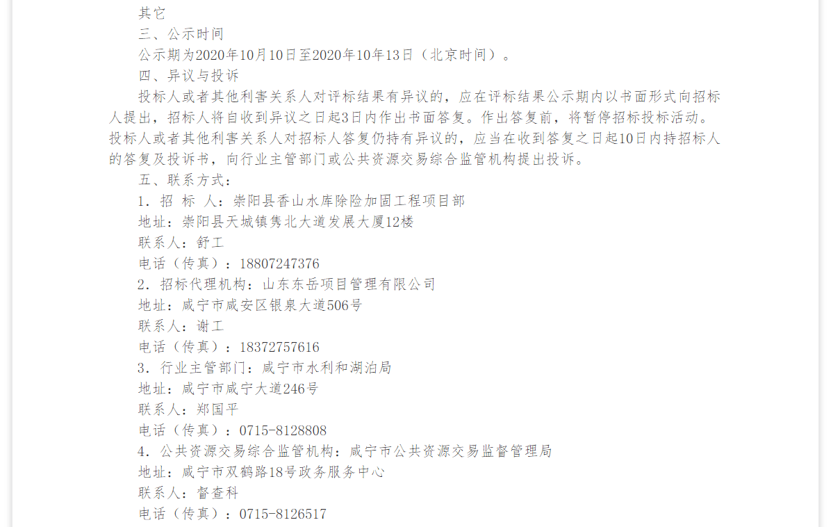 崇阳县香山水库除险加固工程监理招标项目于 2020.09.02日在咸宁市直公共资源电子交易平台发布招标公告/发出投标邀请书,2020.09.28日在咸宁市直公共资源交易中心开标,并于2020.09.28日完成评标工作。根据评标委员会提交的评标报告,崇阳县香山水库除险加固工程监理招标项目已经确认评标结果,现进行评标结果公示。