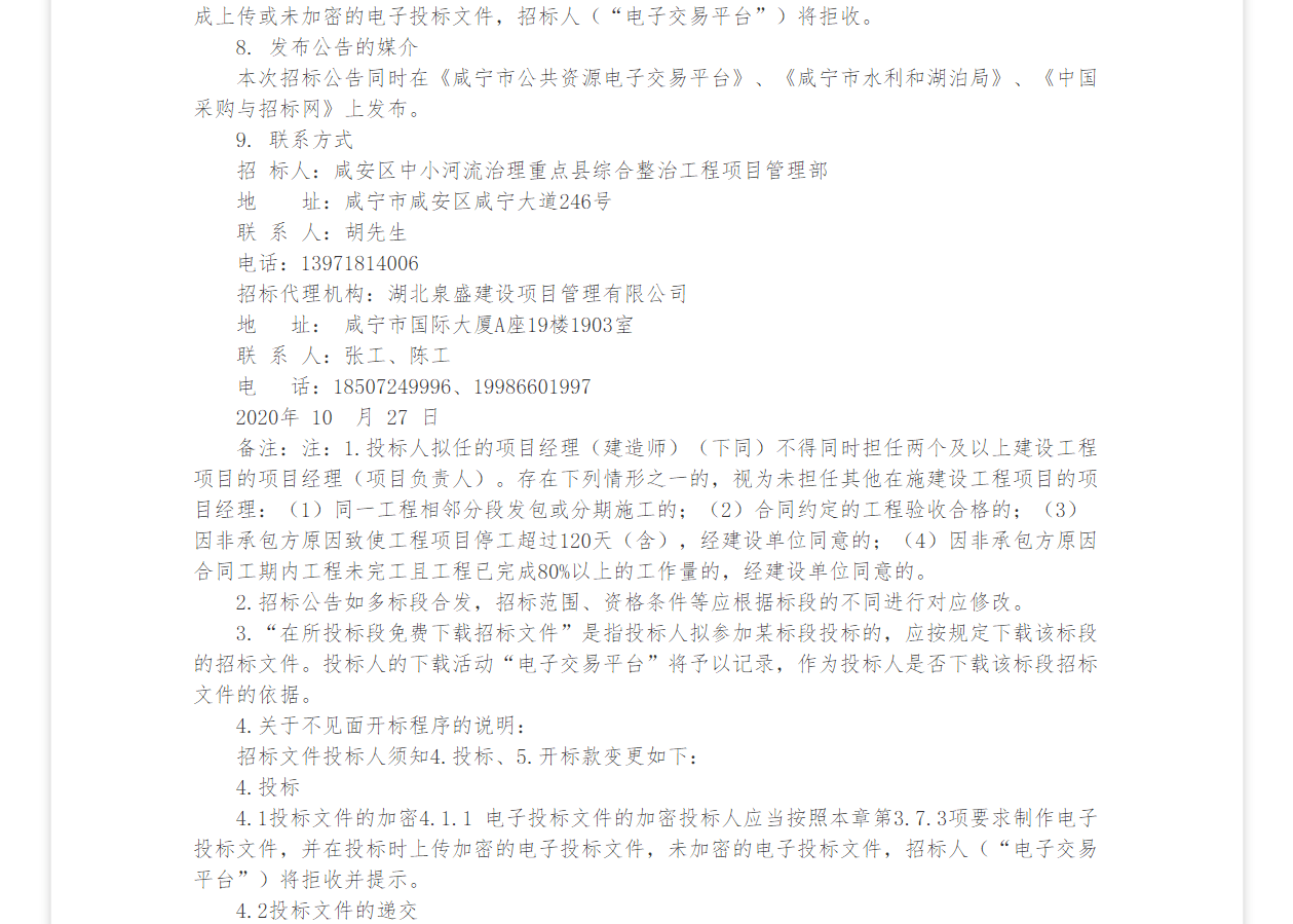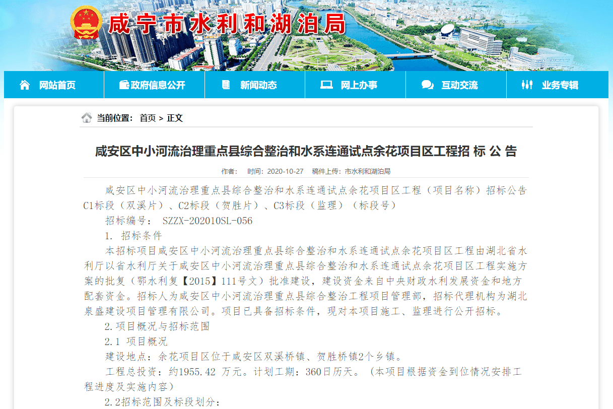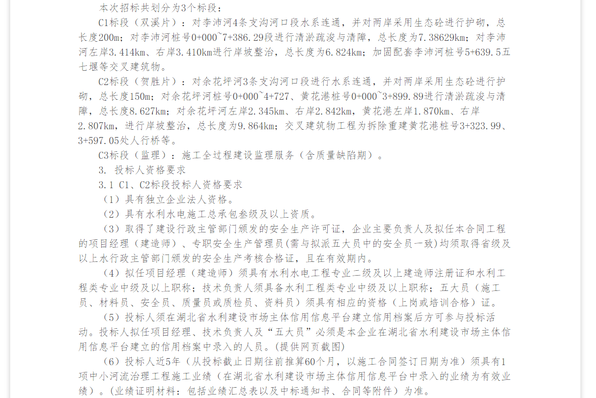 咸安区中小河流治理重点县综合整治和水系连通试点余花项目区工程(项目名称)招标公告C1标段(双溪片)、C2标段(贺胜片)、C3标段(监理)(标段号)