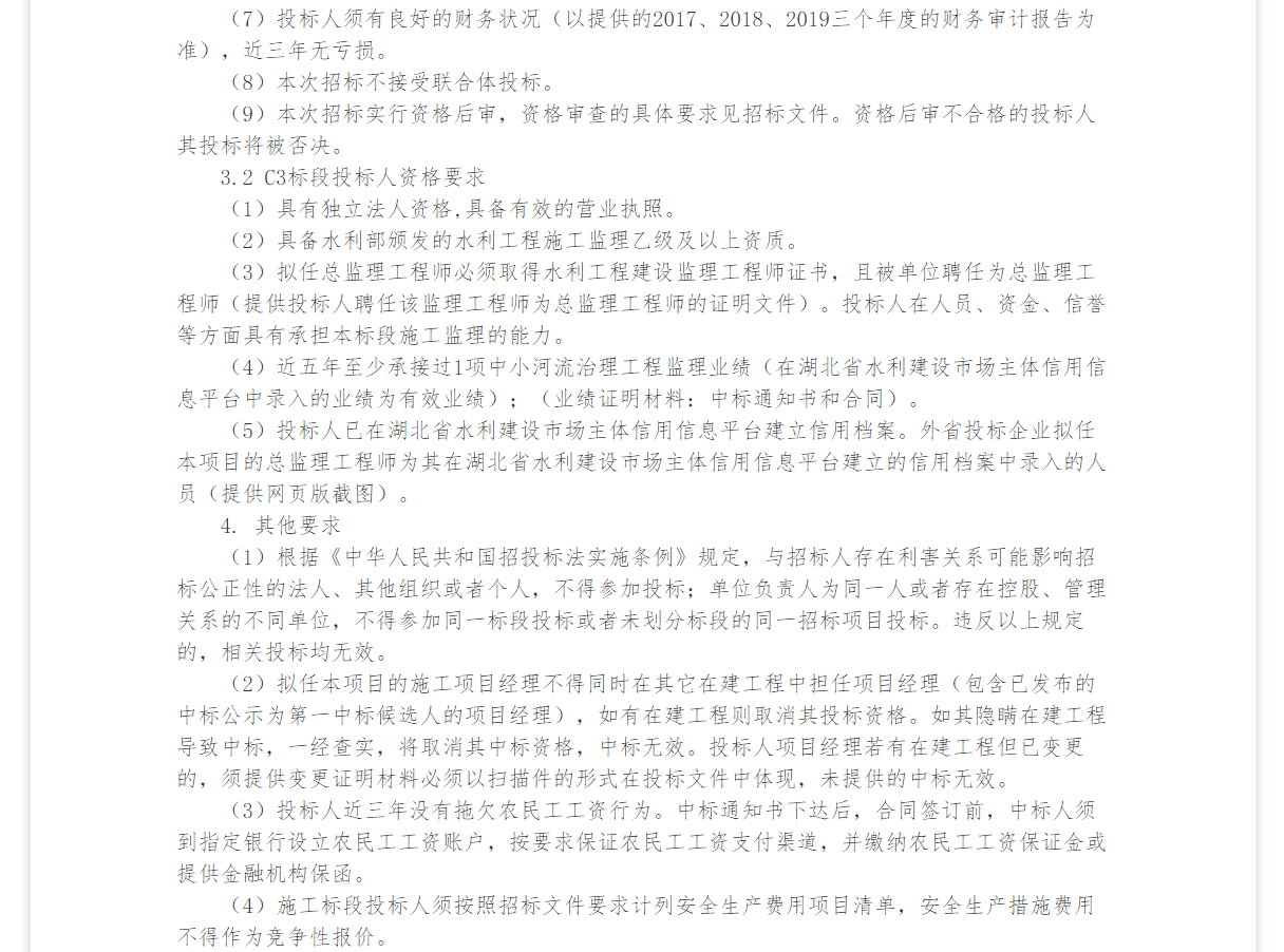 (4)近五年至少承接过1项中小河流治理工程监理业绩(在湖北省水利建设市场主体信用信息平台中录入的业绩为有效业绩);(业绩证明材料:中标通知书和合同)。