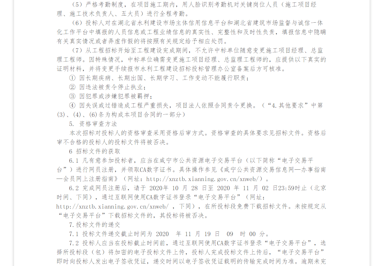 6.2 完成网员注册后,请于 2020年 10 月 28 日至 2020 年 11 月 02 日23:59时止(北京时间、下同),通过互联网使用CA数字证书登录“电子交易平台”(网址:http://xnztb.xianning.gov.cn/xnweb/ ,下同),在所投标段免费下载招标文件。未按规定从“电子交易平台”下载招标文件的,其投标将被否决。