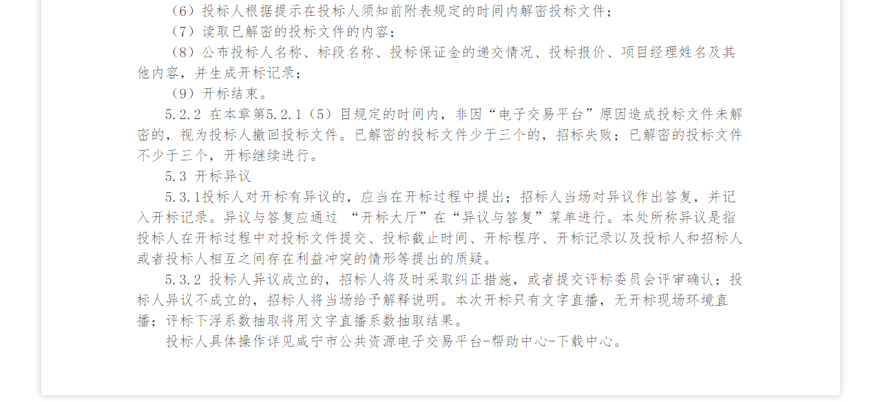 5.3.2 投标人异议成立的,招标人将及时采取纠正措施,或者提交评标委员会评审确认;投标人异议不成立的,招标人将当场给予解释说明。本次开标只有文字直播,无开标现场环境直播;评标下浮系数抽取将用文字直播系数抽取结果。