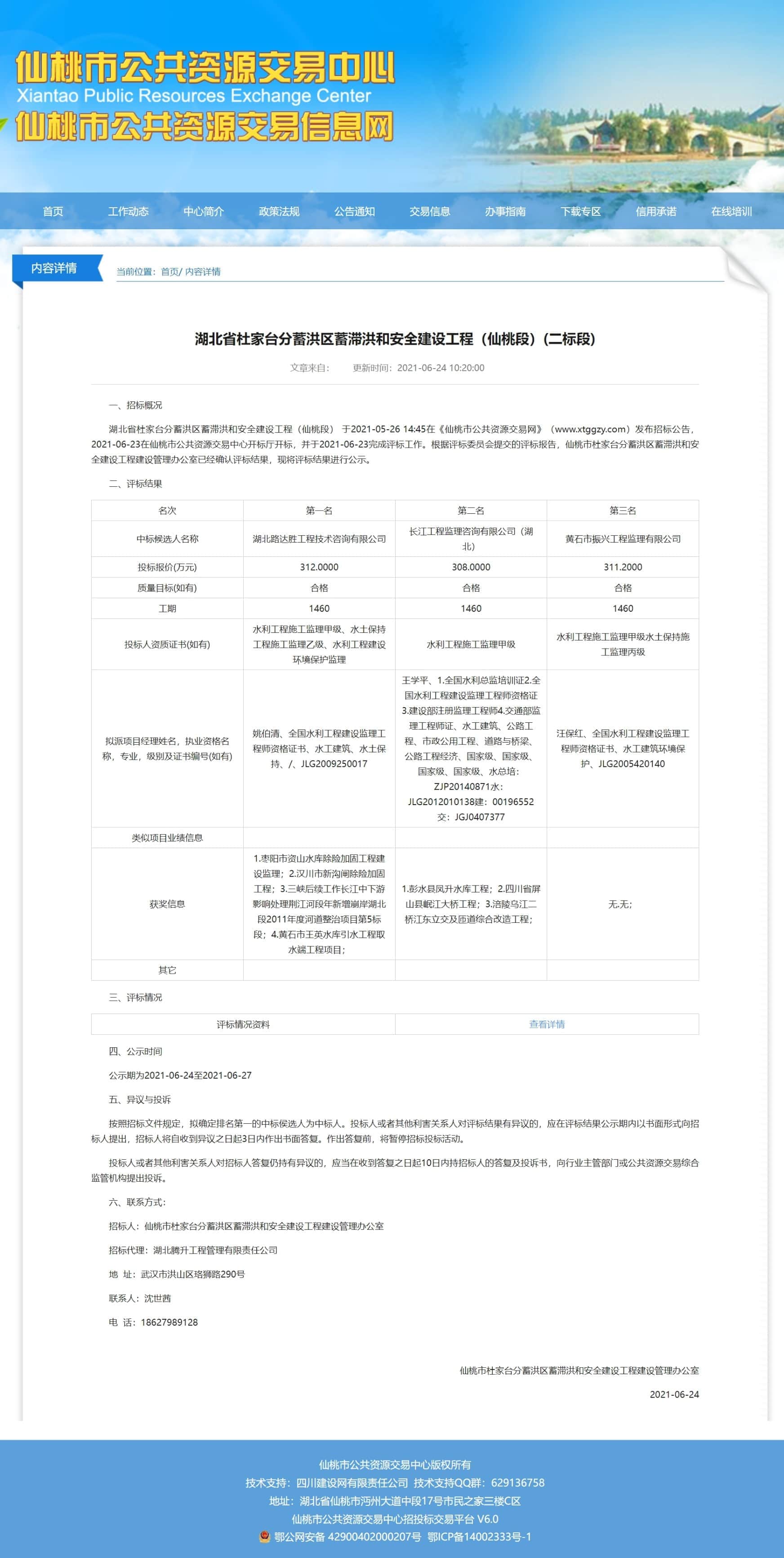湖北省杜家台分蓄洪区蓄滞洪和安全建设工程(仙桃段) 于2021-05-26 14:45在《仙桃市公共资源交易网》(www.xtggzy.com)发布招标公告,2021-06-23在开标,并于完成评标工作。根据评标委员会提交的评标报告,已经确认评标结果,现将评标结果进行公示。