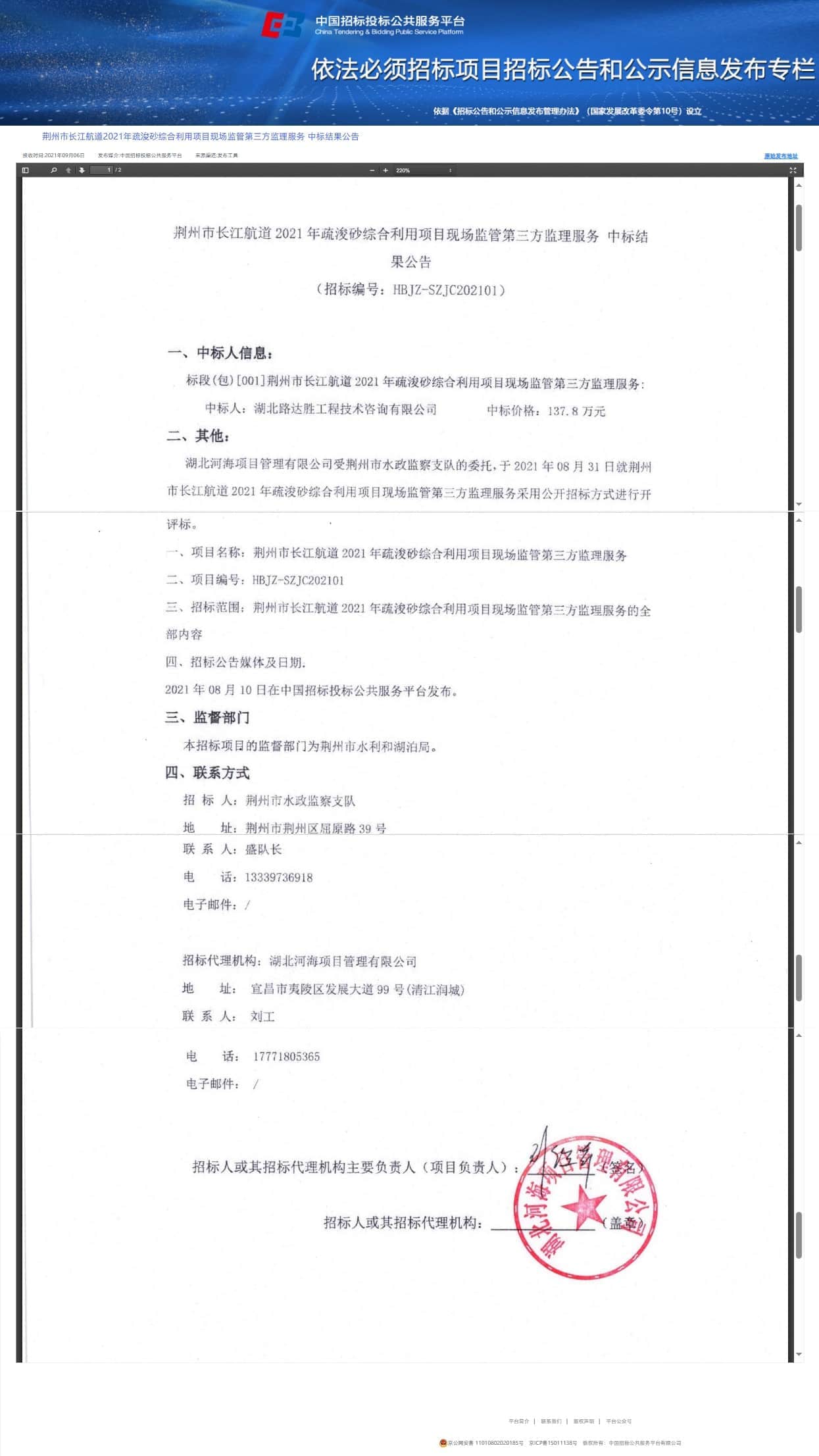 荆州市长江航道2021年疏浚砂综合利用项目现场监管第三方监理服务中标结果公告