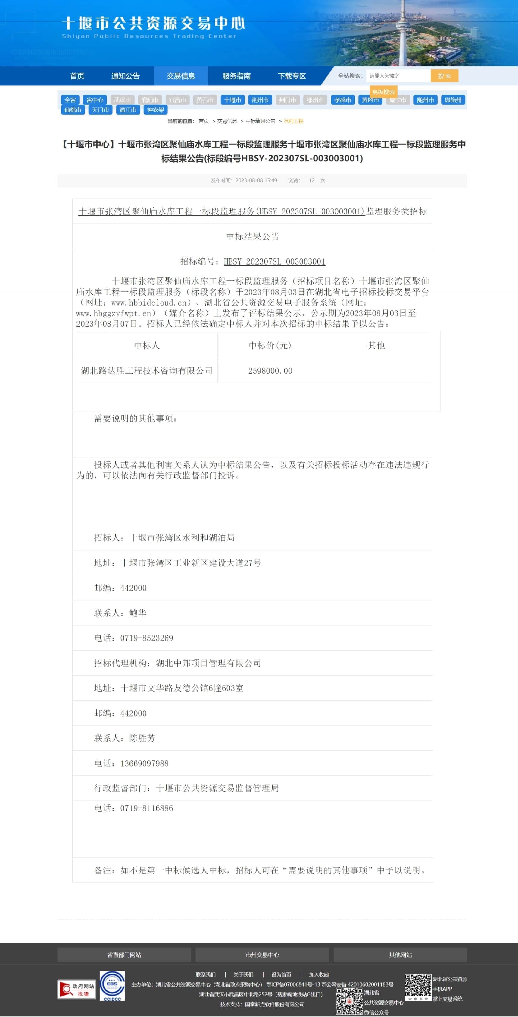 【十堰市中心】十堰市张湾区聚仙庙水库工程一标段监理服务十堰市张湾区聚仙庙水库工程一标段监理服务中标结果公告(标段编号HBSY-202307SL-003003001)