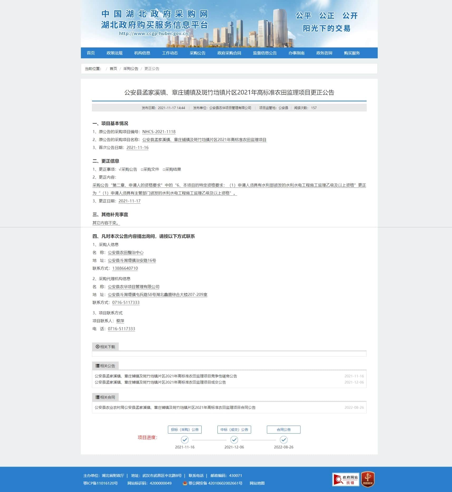 公安县孟家溪镇、章庄铺镇及斑竹垱镇片区2021年高标准农田监理项目更正公告