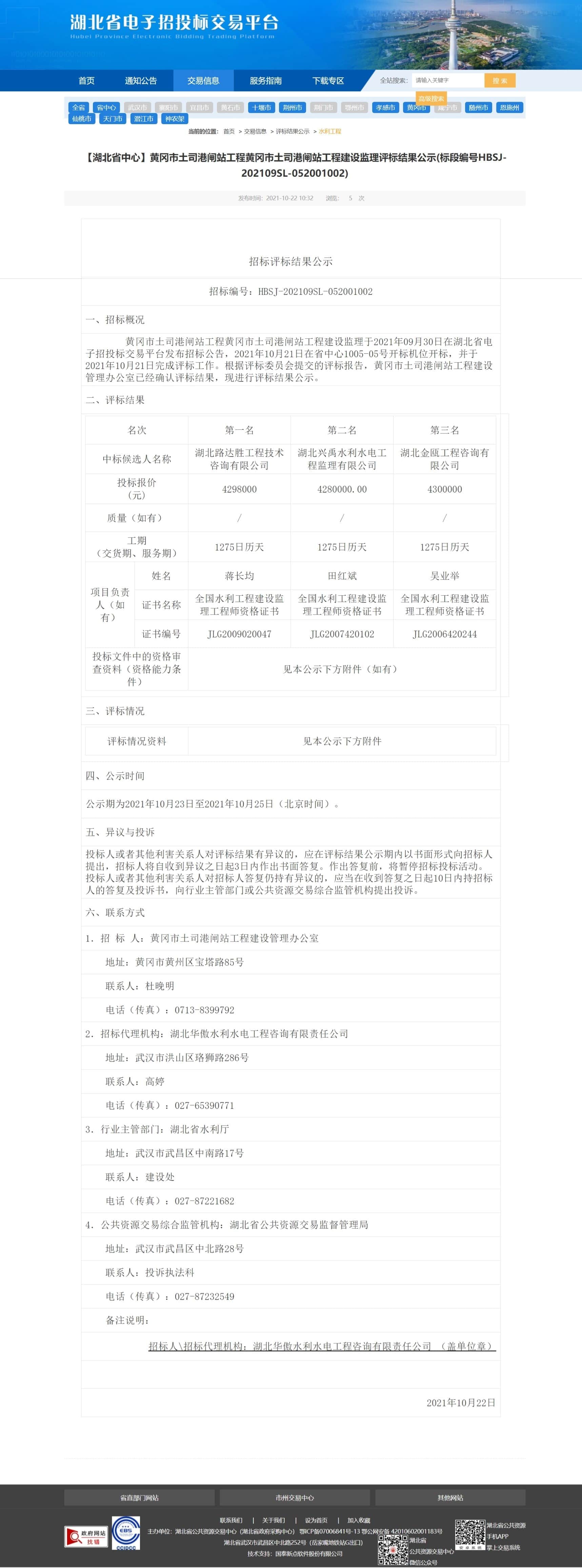 【湖北省中心】黄冈市土司港闸站工程黄冈市土司港闸站工程建设监理评标结果公示(标段编号HBSJ-202109SL-052001002)