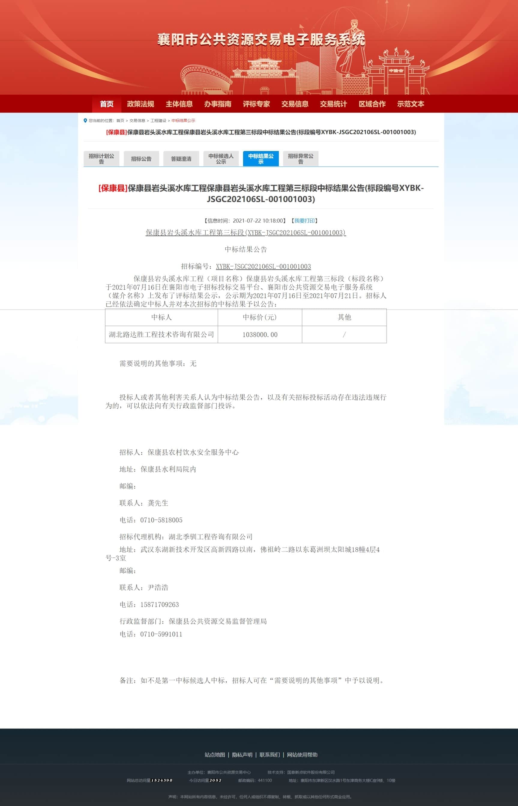 [保康县]保康县岩头溪水库工程保康县岩头溪水库工程第三标段中标结果公告(标段编号XYBK-JSGC202106SL-001001003)
