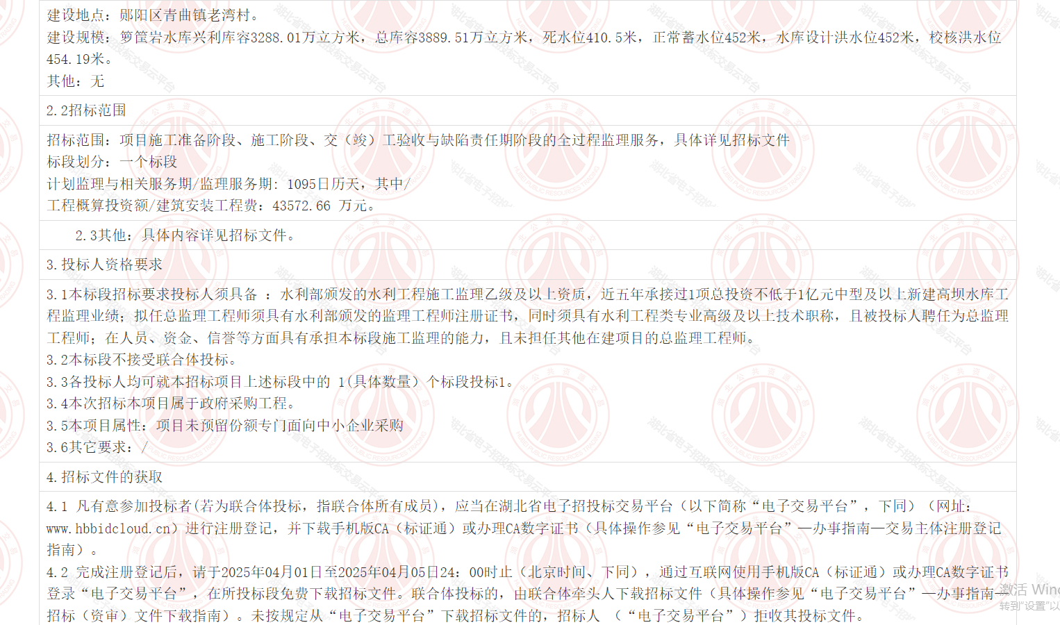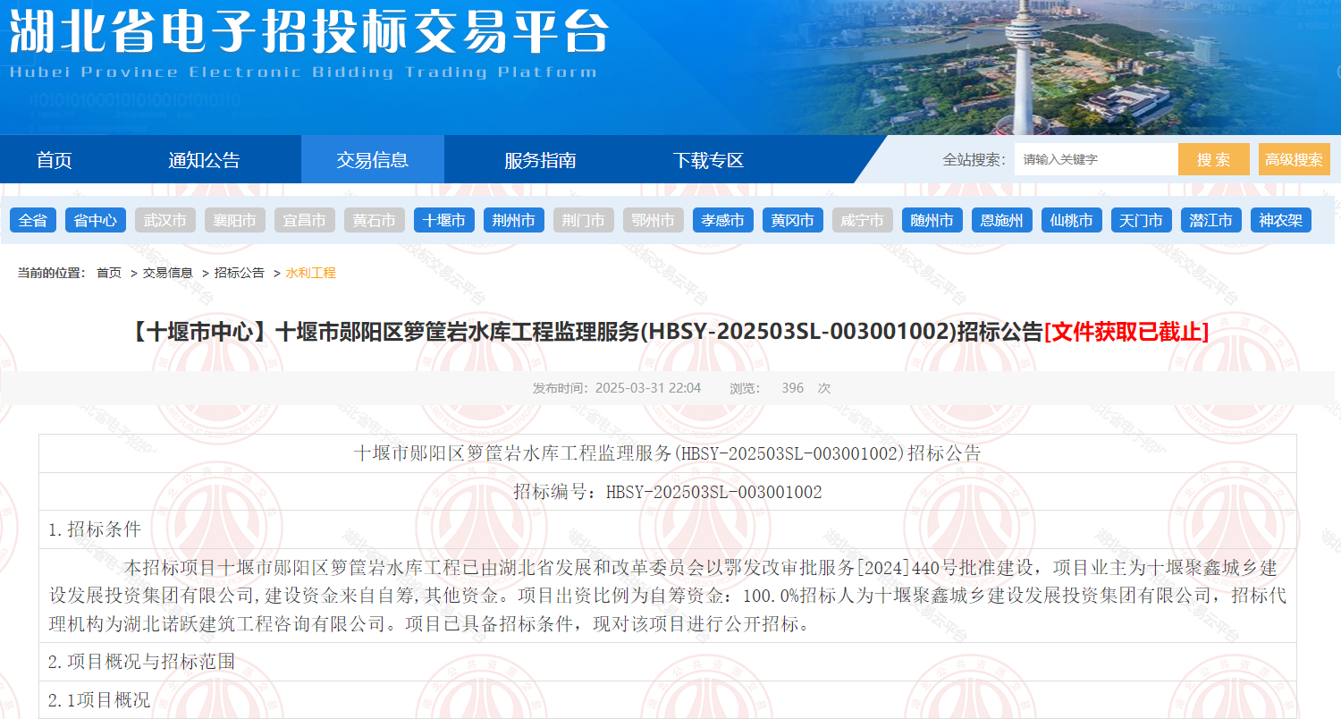 十堰市郧阳区箩筐岩水库工程监理服务(HBSY-202503SL-003001002)招标公告