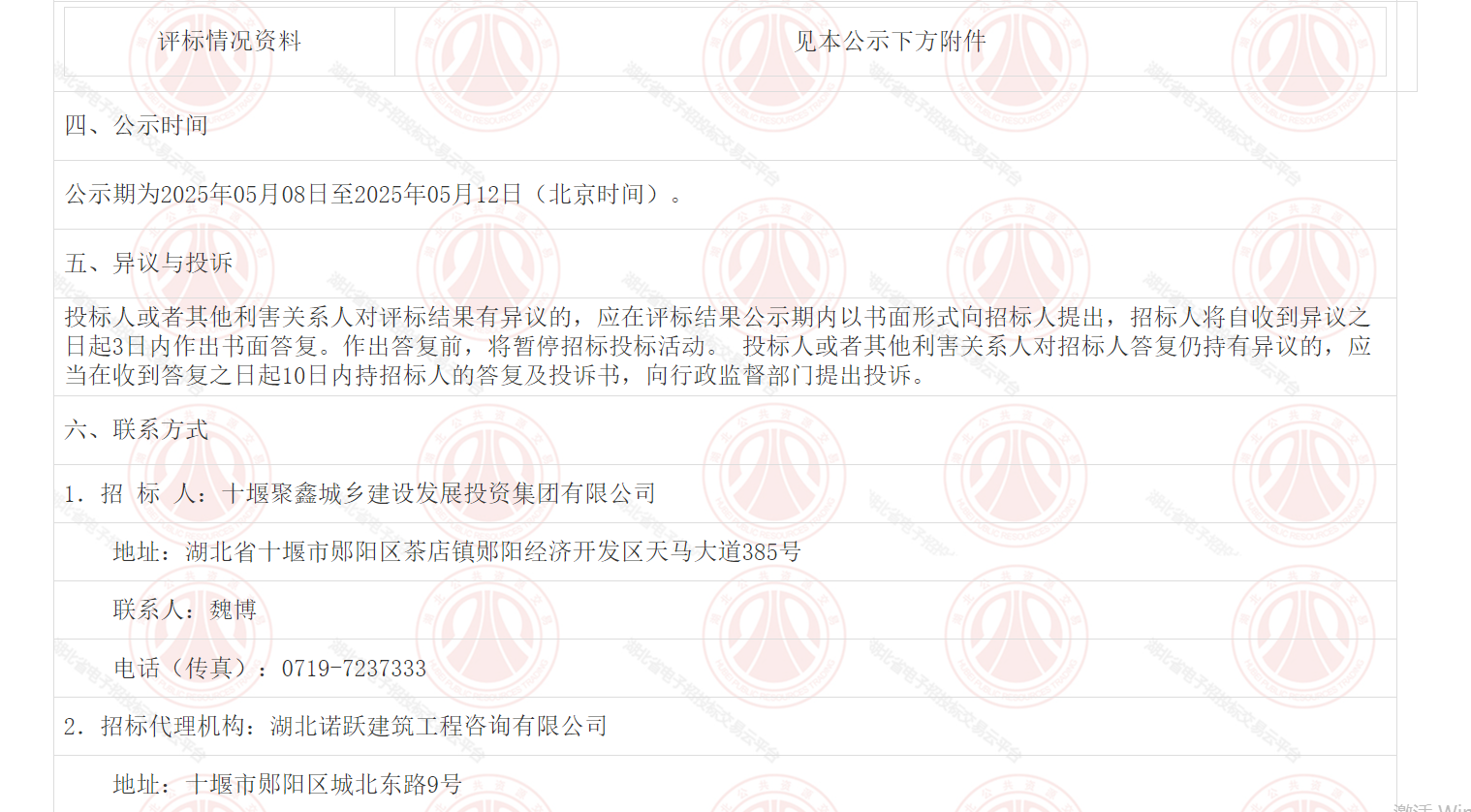 十堰市郧阳区箩筐岩水库工程监理服务于2025年03月31日在湖北省电子招投标交易平台发布招标公告,2025年05月06日在十堰市1号开标机位开标,并于2025年05月06日完成评标工作。 根据评标委员会提交的评标报告},十堰聚鑫城乡建设发展投资集团有限公司已经确认评标结果,现进行评标结果公示。
