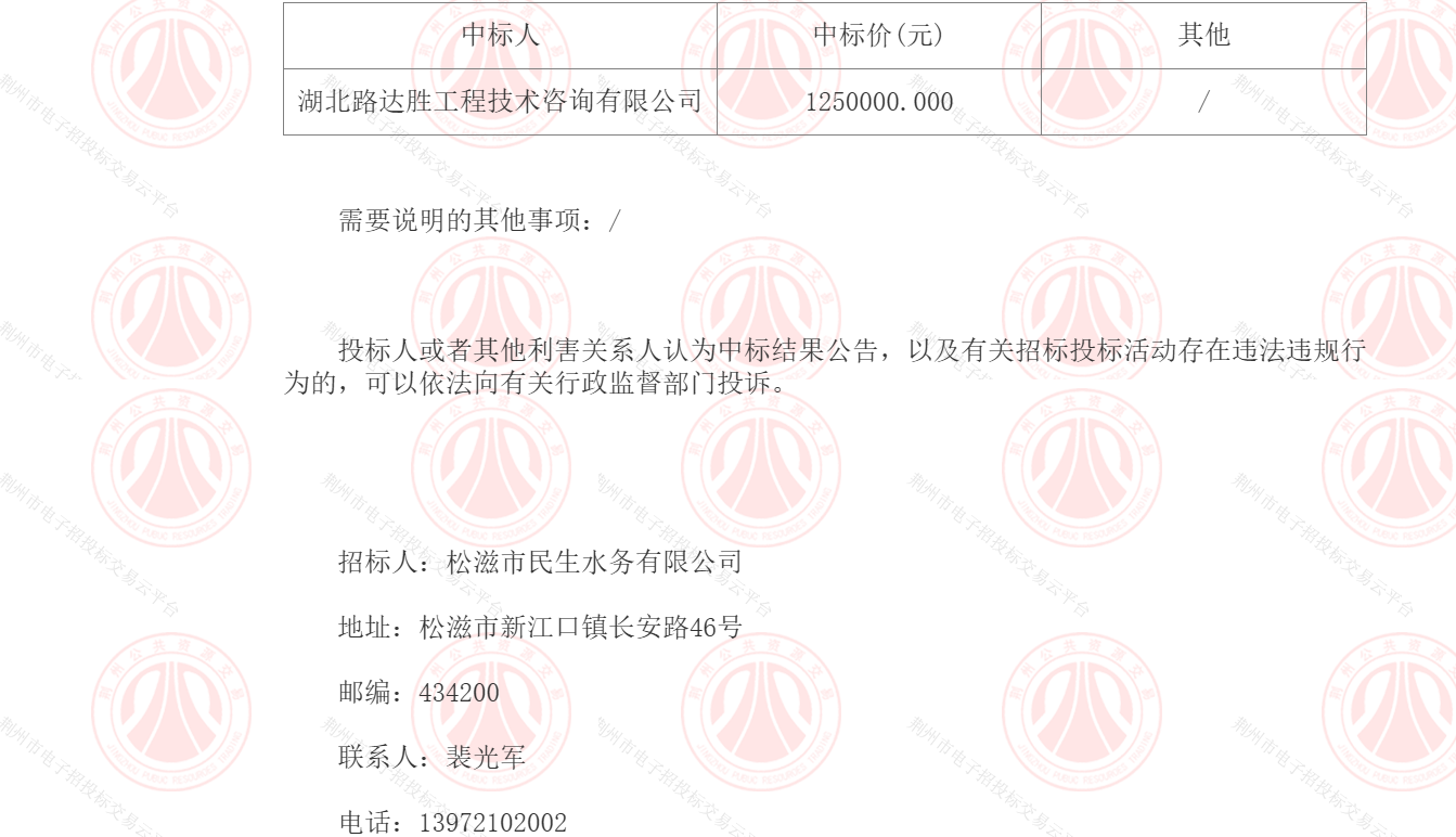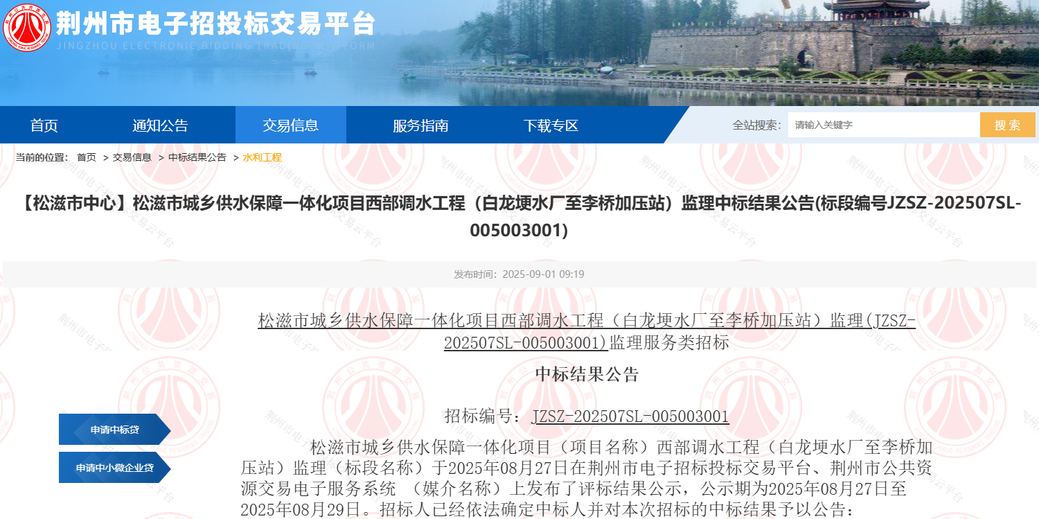 松滋市城乡供水保障一体化项目(项目名称)西部调水工程(白龙埂水厂至李桥加压站)监理(标段名称)于2025年08月27日在荆州市电子招标投标交易平台、荆州市公共资源交易电子服务系统 (媒介名称)上发布了评标结果公示,公示期为2025年08月27日至2025年08月29日。招标人已经依法确定中标人并对本次招标的中标结果予以公告: