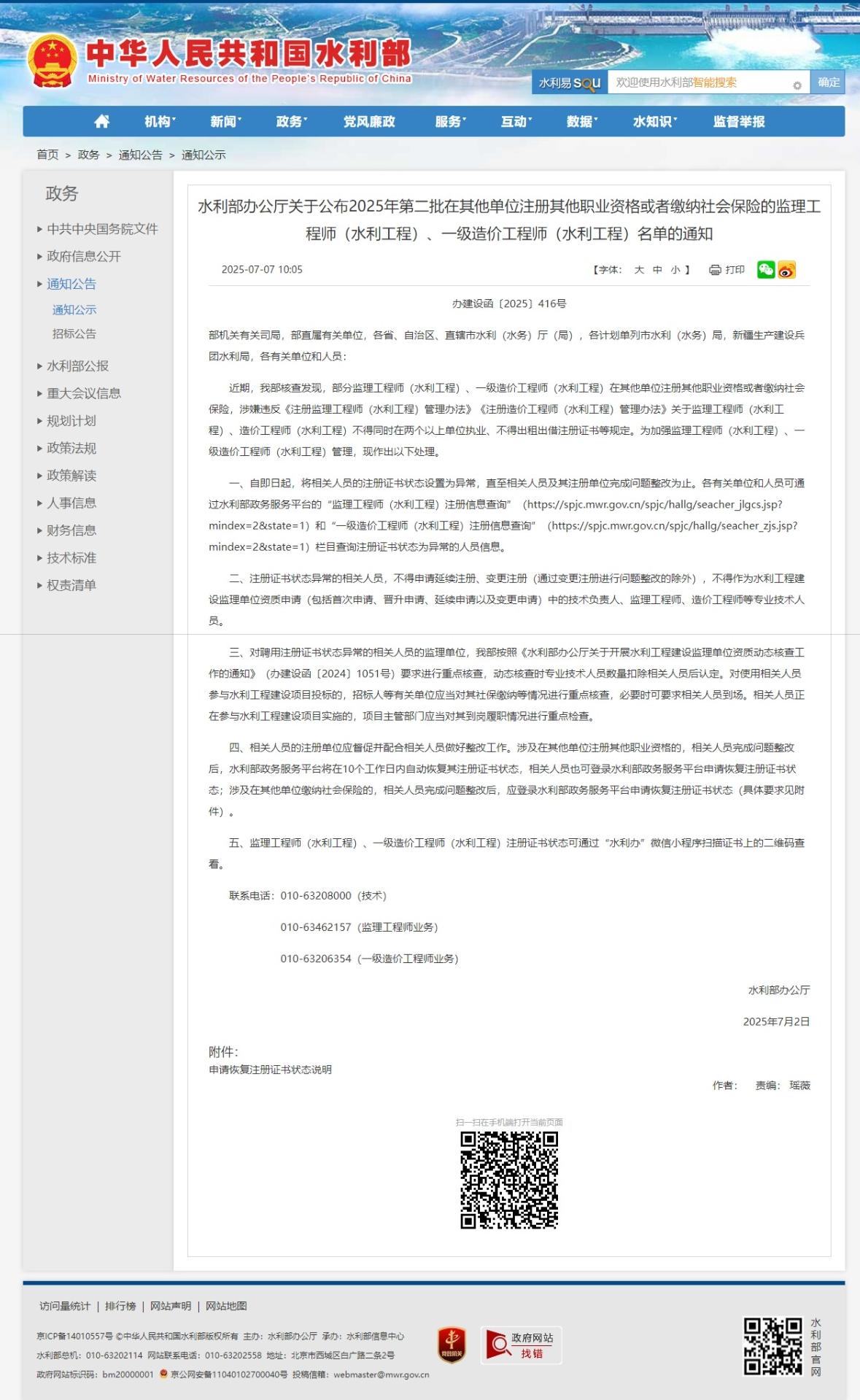 水利部办公厅关于公布2025年第二批在其他单位注册其他职业资格或者缴纳社会保险的监理工程师(水利工程)、一级造价工程师(水利工程)名单的通知