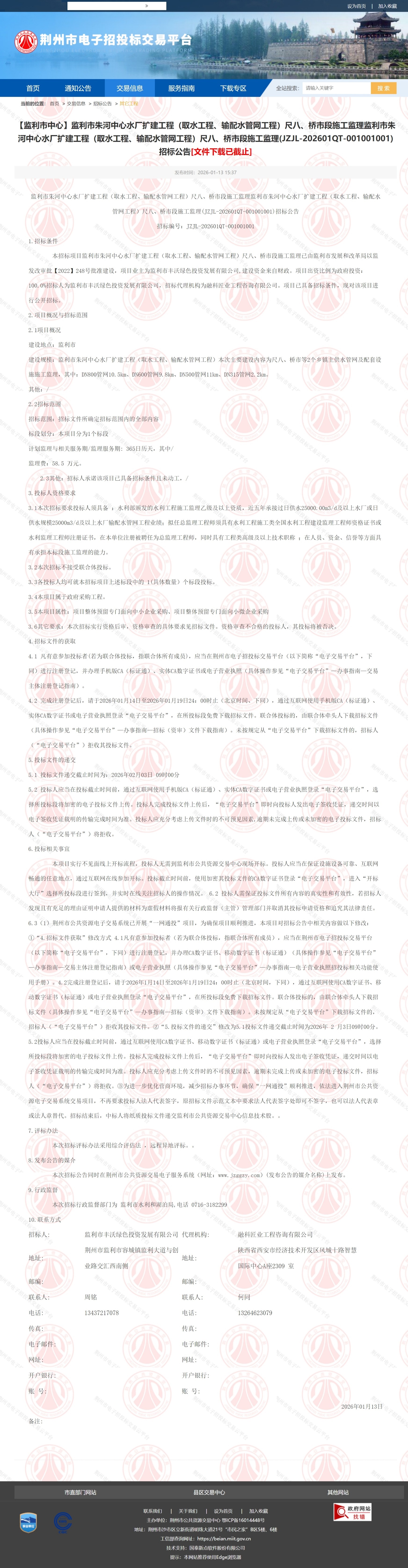 9.行政监督 本次招标行政监督部门为 监利市水利和湖泊局,电话 0716-3182299
