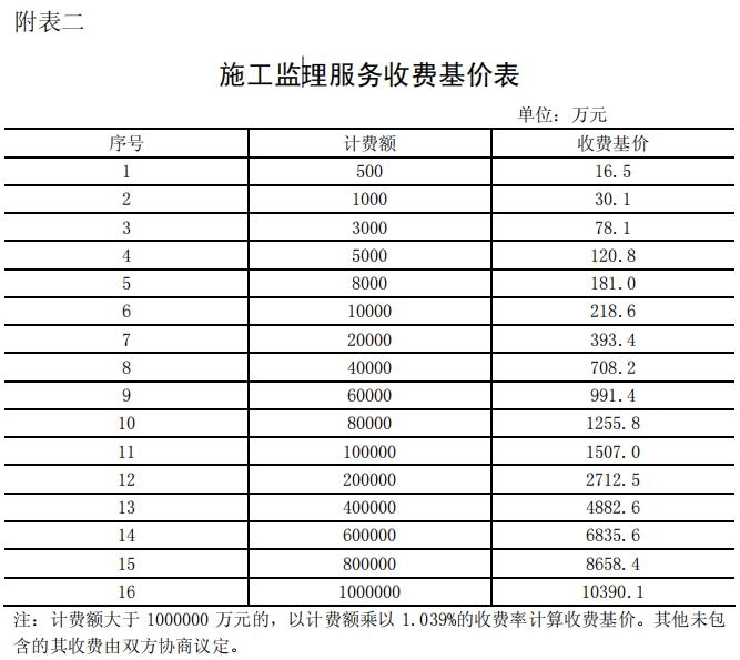 (1)施工监理服务收费基价:按《施工监理服务收费基价表》(附表二)确定,计费额处于两个数值区间的,采用直线内插法确定施工监理服务收费基价。施工监理服务收费以建筑安装工程费分档定额计费方式收费的,其计费额为工程概算中的建筑安装工程费、设备购置费和联合试运转费之和,即工程概算投资额。