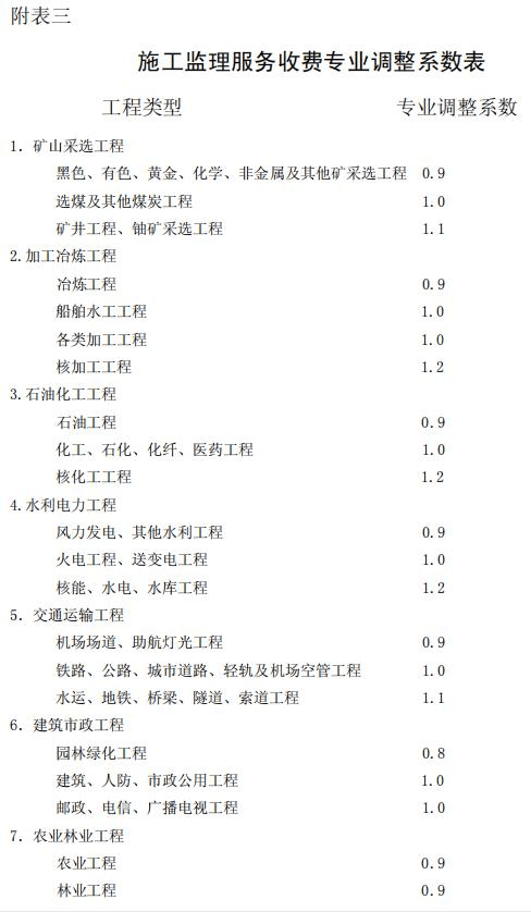 (3)专业调整系数:是对不同专业建设工程的施工监理工作复杂程度和工作量差异进行调整的系数。计算施工监理服务收费时,专业调整系数在《施工监理服务收费专业调整系数表》(附表三)中查找确定。
