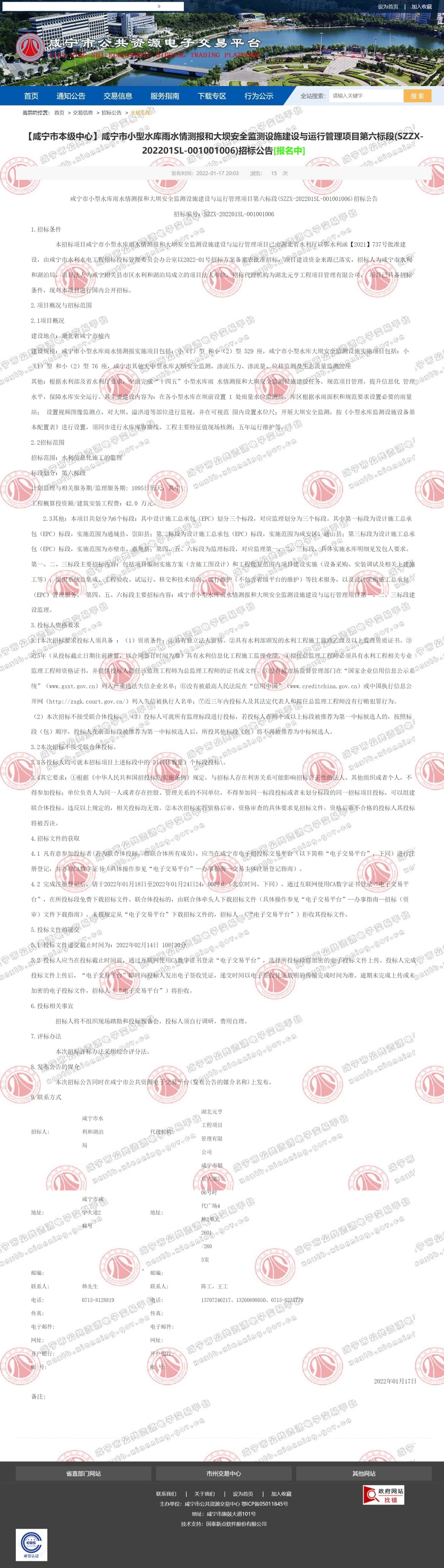 | 本招标项目咸宁市小型水库雨水情测报和大坝安全监测设施建设与运行管理项目已由湖北省水利厅以鄂水利函【2021】737号批准建设,由咸宁市水利水电工程招标投标管理委员会办公室以2022-01号招标方案备案表批准招标,项目建设资金来源已落实,招标人为咸宁市水利和湖泊局,项目法人为咸宁相关县市区水利和湖泊局成立的项目法人单位,招标代理机构为湖北元亨工程项目管理有限公司, 项目已具备招标条件,现对本项目进行国内公开招标。 | |||||||||||||||||||||||||||||||||||||||||