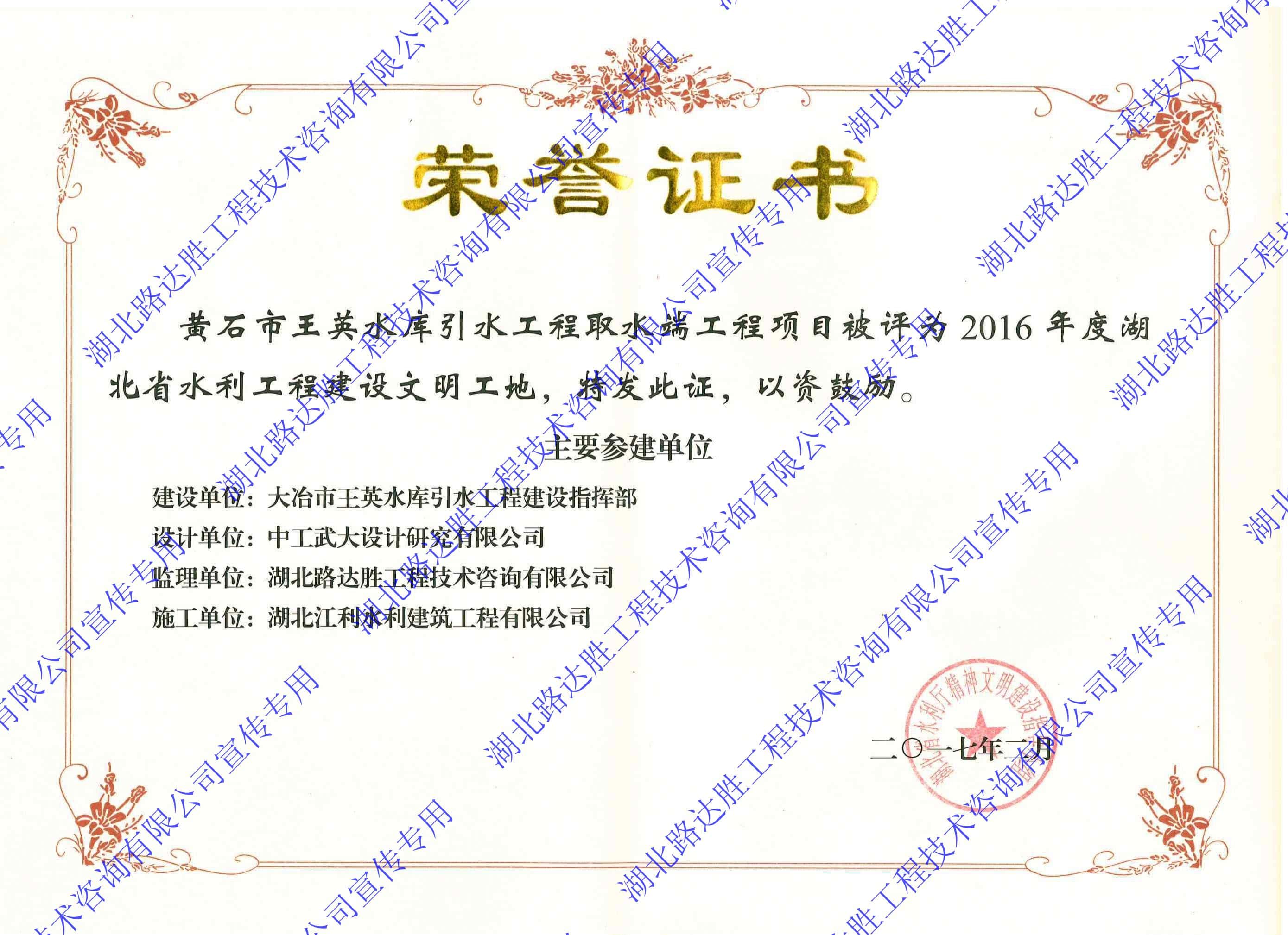 2016年度湖北省水利工程建设文明工地