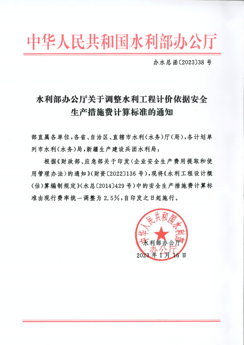 根据《财政部、应急部关于印发〈企业安全生产费用提取和使用管理办法〉的通知》(财资〔2022〕136号),现将《水利工程设计概(估)算编制规定》(水总〔2014〕429号)中的安全生产措施费计算标准由现行费率统一调整为2.5%,自印发之日起施行。